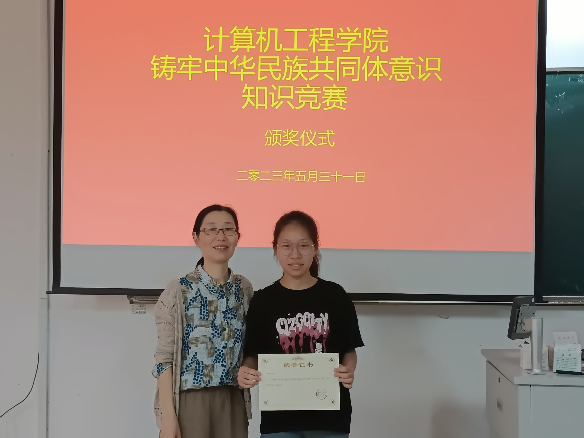 颁奖仪式上,学院关工委退休教师王葆红老师为获奖学生颁发了证书,并对参赛学生提出期望,希望他们能深刻认识铸牢中华民族共同体意识的重大意义,更加坚定维护民族团结的信念。