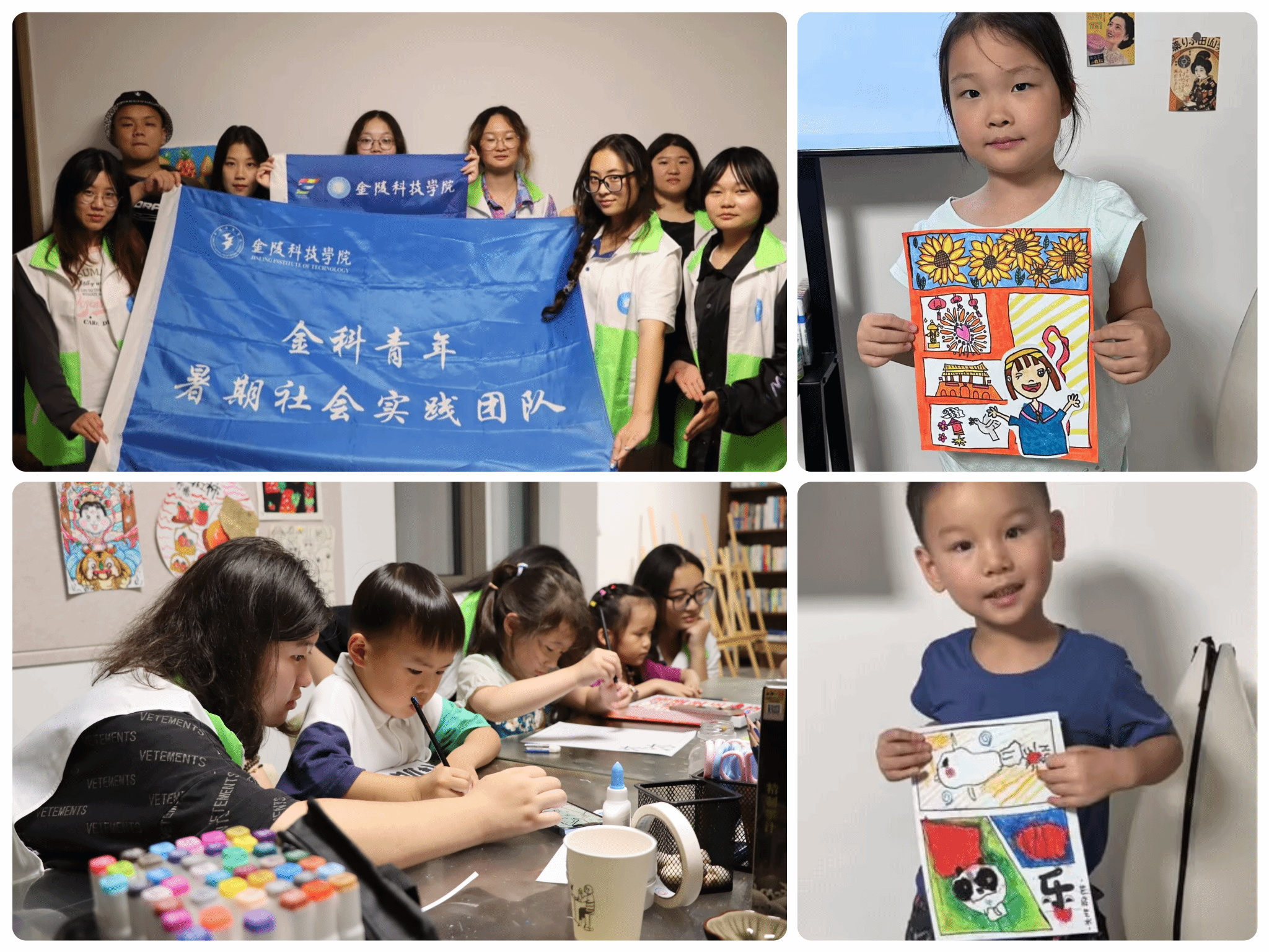传承红色基因,赓续红色血脉。“探访红色事迹,弘扬红色精神”团队前往常州瞿秋白同志纪念馆,通过实地考察和采访的形式挖掘瞿秋白同志鲜为人知的红色故事,并以此为蓝本创作漫画,赋予红色故事以时代特色。“爱党爱国爱心暑托班”团队深入乡村,在为家长们托管小朋友的同时,教会孩子们用色彩丰富的画笔,表达了对革命先烈和对祖国母亲的热爱。