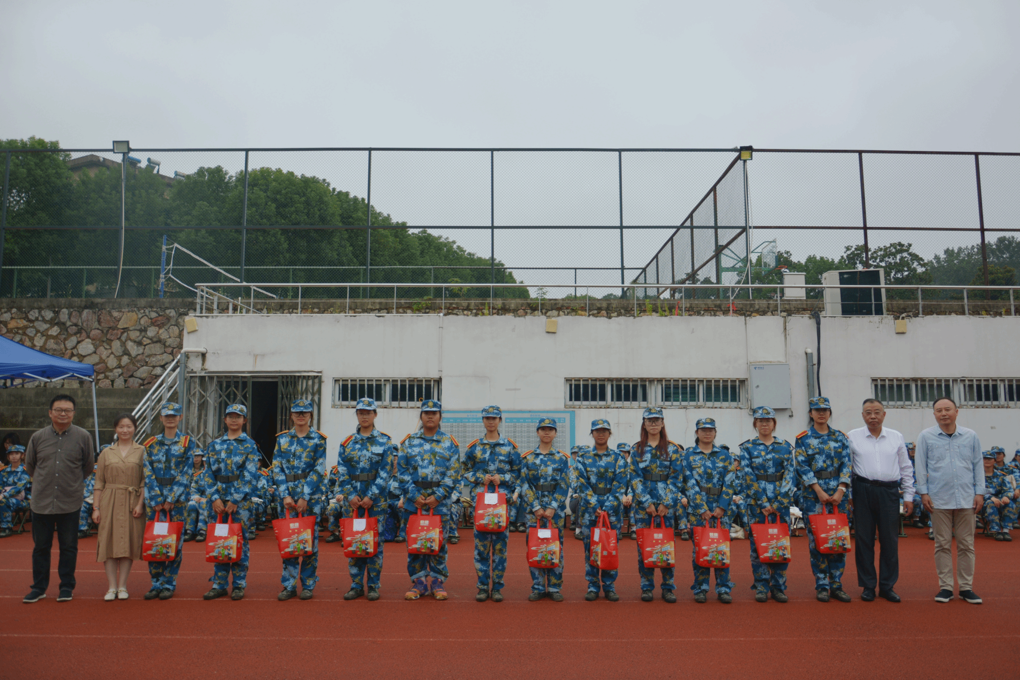 伴随着初秋凉爽的微风,2023级新生们身着迷彩服,迈着铿锵的步伐,带着坚定的眼神,在操场上挥洒青春的汗水。9月25日上午,人文学院党委书记吴轶军、院长张维亚、副书记韩铖、副院长赵步阳与学工办主任童明明,副主任高欢欢、辅导员汪新、康健老师一同来到军训场地为参训新生发放慰问礼包,亲切慰问了2023级新生和教官。