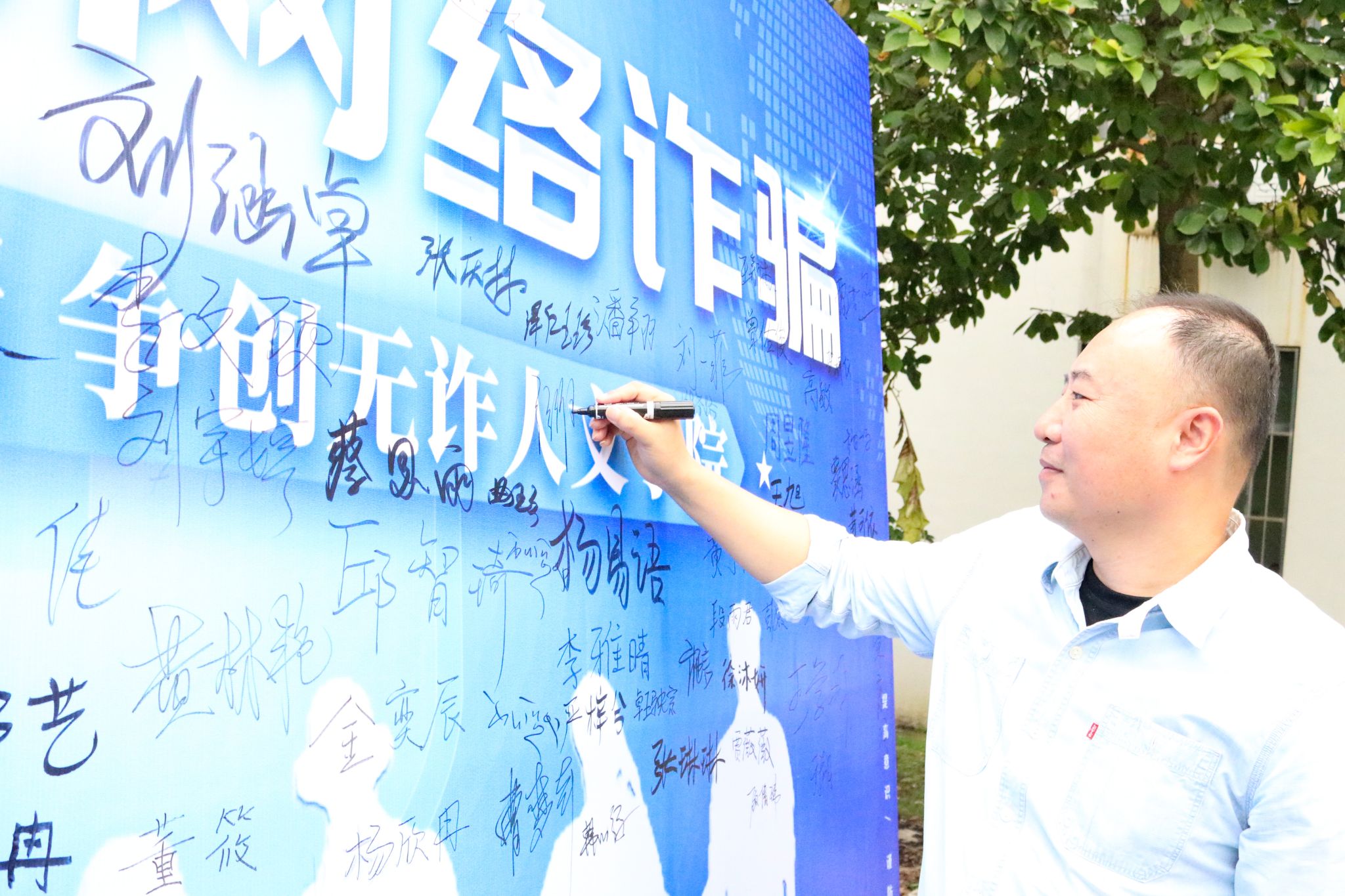活动现场,安全工作负责辅导员张琳老师与反诈志愿者一起开展防范电信网络诈骗宣传教育,以案例讲解的形式生动传达了常见诈骗类型、特点和危害,掌握必要的防范技能,构筑坚实的思想防线。同时,学院采取展板、横幅、拍照打卡等形式,号召老师和学生在宣传展板上签名,表达对防范电信网络诈骗的决心。此外,学院充分利用QQ、微信群等线上平台向学生发送信息提醒,尤其对于新生和毕业生班级,确保将“防诈”、“反诈"内容传达到每一位学生。