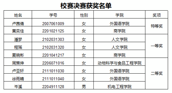 经过激烈角逐,来自外国语学院的卢茜倩同学和商学院的黄奕佳同学荣获特等奖,人文学院的潘梦等7名同学分获一等奖和二等奖。两位特等奖选手将与通过国才考试直接晋级的商学院鲁羽轩同学一起,代表学校参加省级决赛。(通讯员:端义镭)
