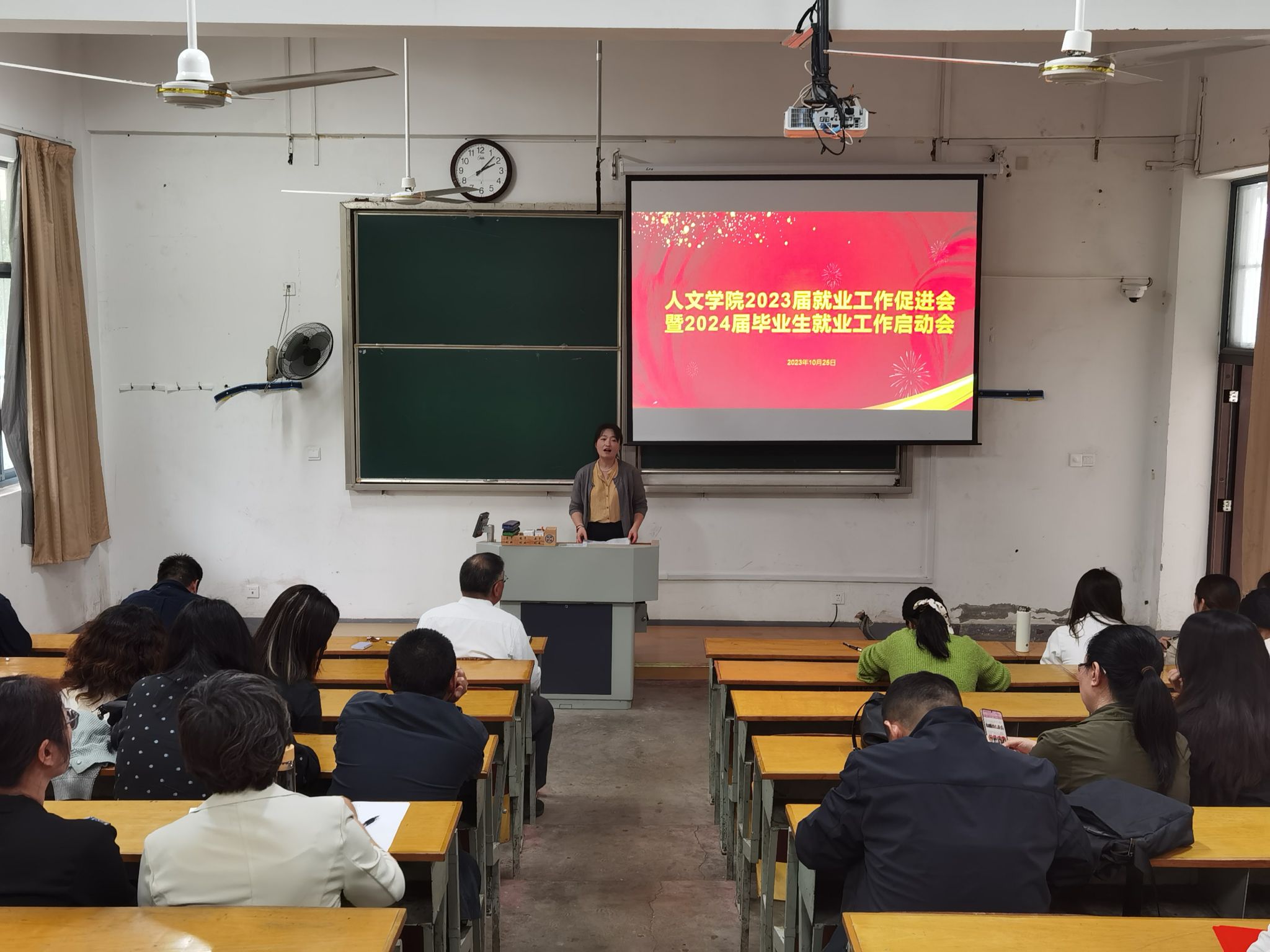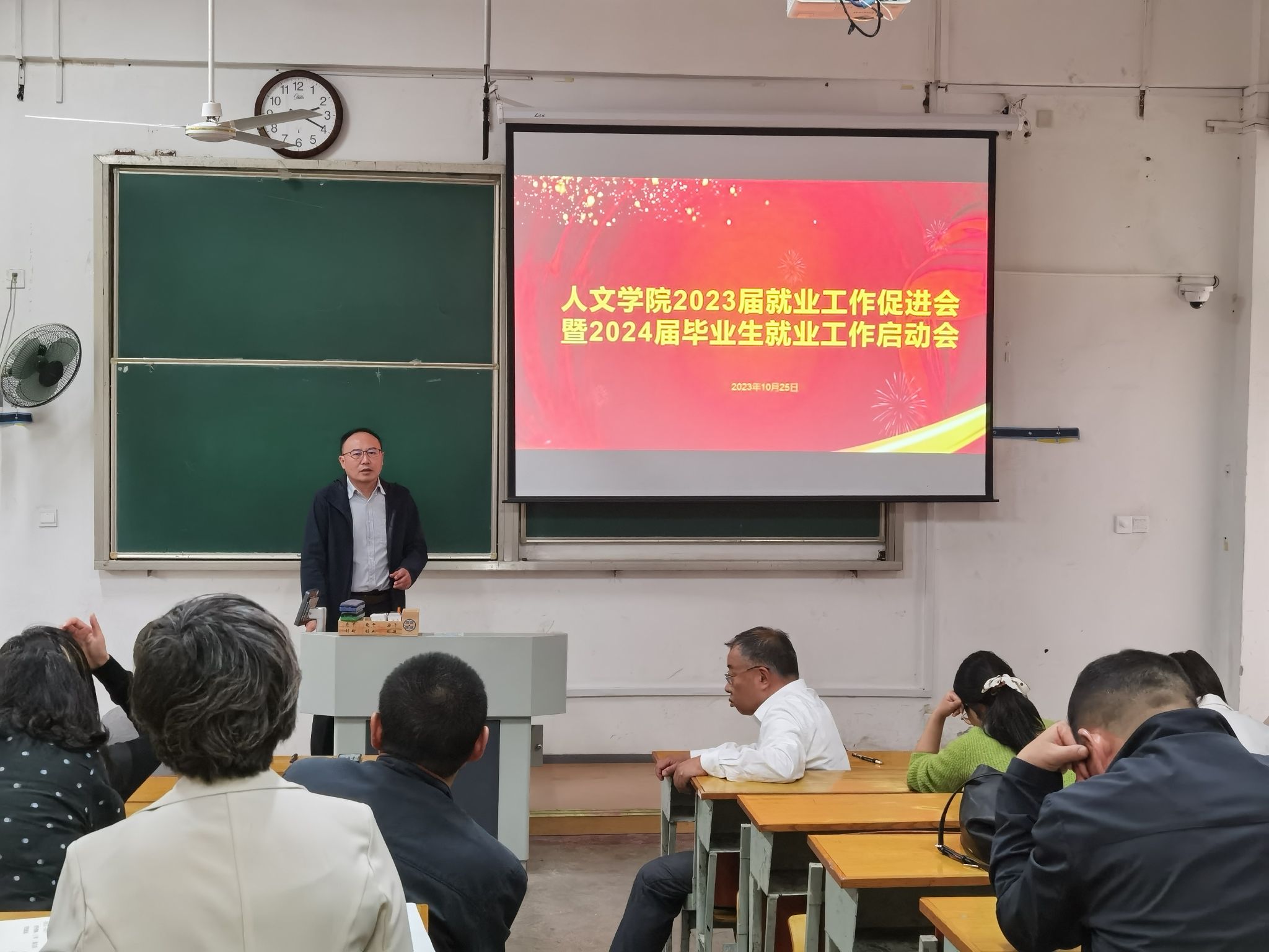 10月25日下午,人文学院在教学楼二阶召开了2023届就业工作促进会暨2024届毕业生就业工作启动会。人文学院党委书记吴轶军、院长张维亚、党委副书记韩城、副院长赵步阳,与各系正副主任、毕业班班主任及辅导员参加了会议。