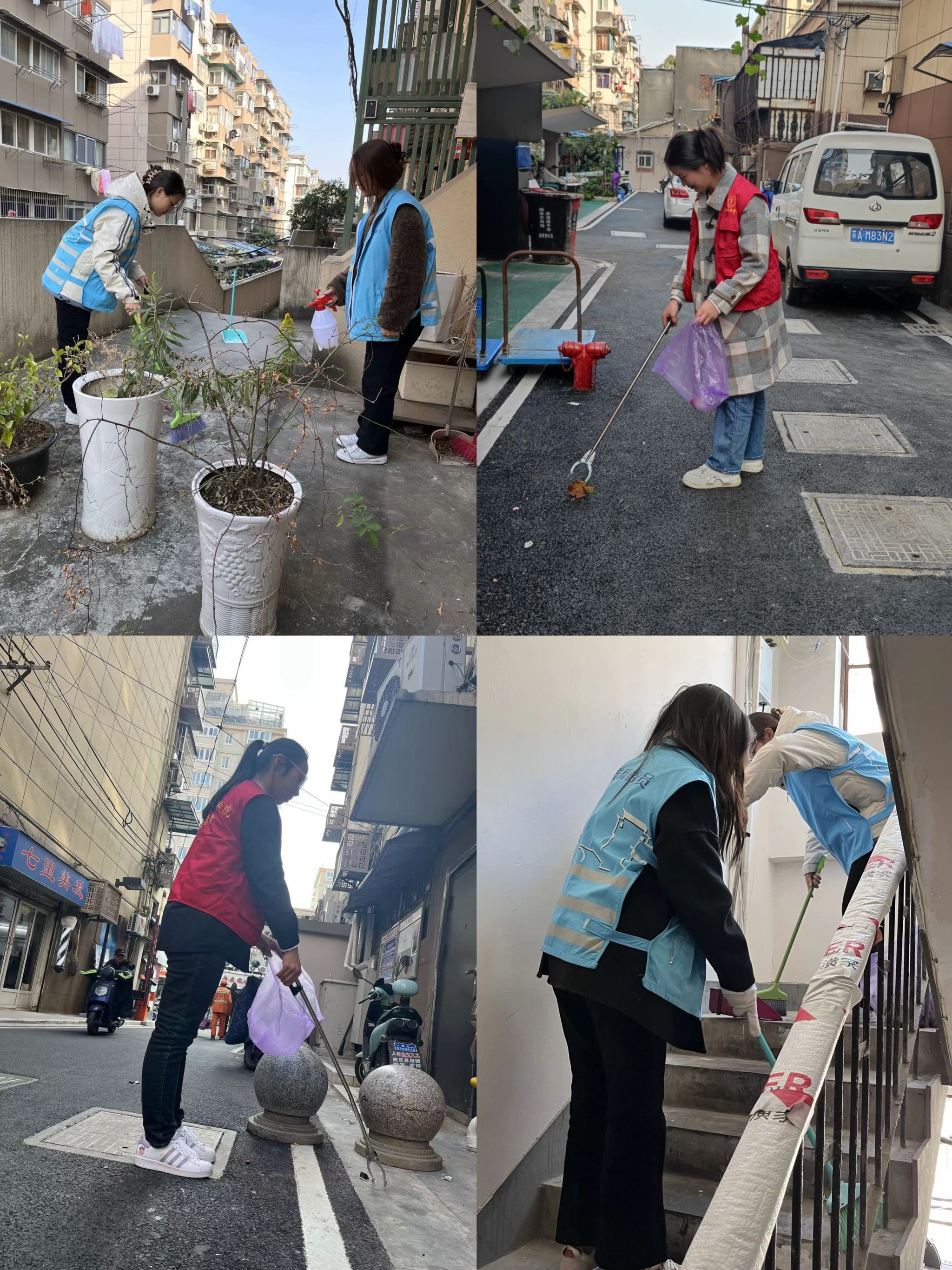 第三组志愿者则协助社区工作人员对社区进行卫生清理。志愿者们发扬吃苦耐劳、无私奉献的精神,在社区工作人员的带领下,针对楼道杂物堆积、非机动车乱停放进行治理,为老人们美化生活环境。虽然冒着寒风工作很辛苦,但为了让老人生活得更加舒适,志愿者们甘之如饴。