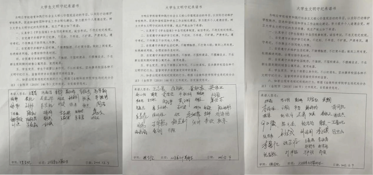 此外,各班级学生在班会上还签署了《大学生文明守纪承诺书》,要求每一位同学都能认真遵守考风考纪,拒绝作弊、抄袭等不良行为,以实力取得优异成绩,以诚信展现优良学风。