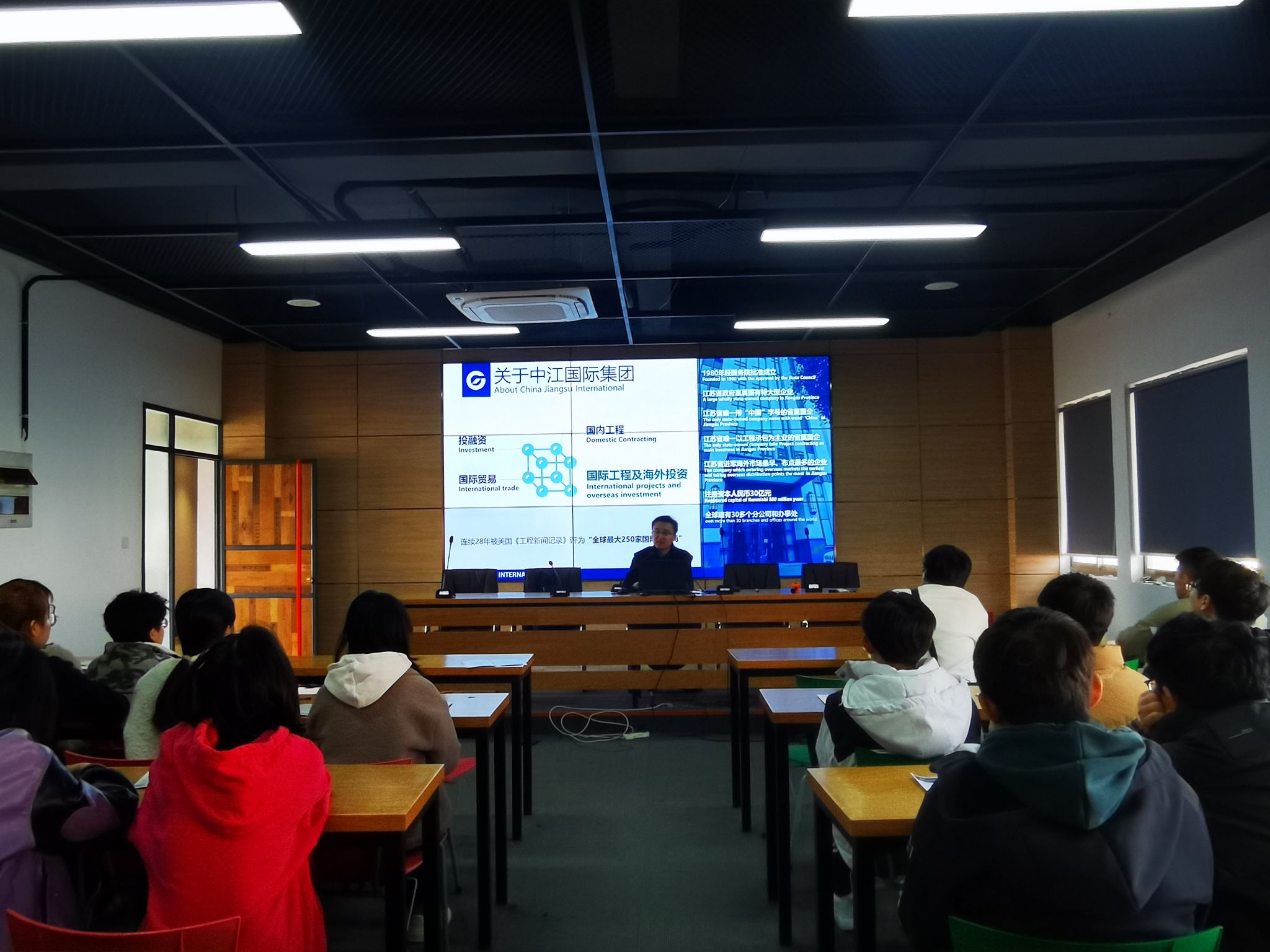 为进一步推进2024届毕业生就业工作,为毕业生提供更多优质就业机会,3月15日,建筑工程学院邀请中国江苏国际经济技术合作集团有限公司(简称“中江国际”)来校招聘,招聘会由的中江国际招聘经理王劲捷先生主讲。为学院的毕业生们举办了一场精彩而深入的招聘宣讲会。