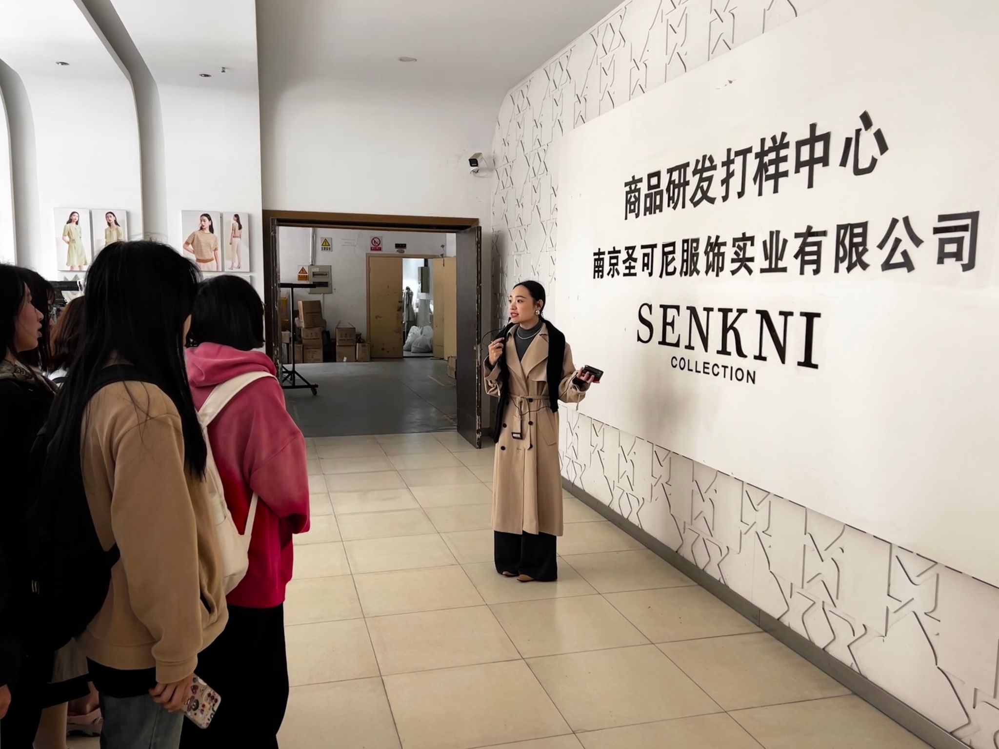 为提高课堂实践教学效果,将课堂教学与企业实践相结合,让学生在课堂之外拓宽视野,激发创新热情,规划职业道路,3月21日上午,艺术学院组织了“企业实践正当时,职业生涯早规划”主题实践活动,艺术学院党委副书记鲍锐、服装系副主任许可带领2022级40名学生赴南京圣可尼服饰实业有限公司参观。人力资源部总经理马师晨带领学生参观了圣可尼工业园区,就企业整体概况、经营理念、人才需求等进行了详细的介绍。随后,企业骨干带领学生参观了零售、设计、加工等相关工作部门,同时也参观了宿舍、食堂等生活区,并提出希望大家能够加入到圣可尼的大家庭里。通过宣讲会和讲解参观,学生们深入了解了企业文化,明确了各个岗位需求,也学习到了很多关于服装方面的知识。