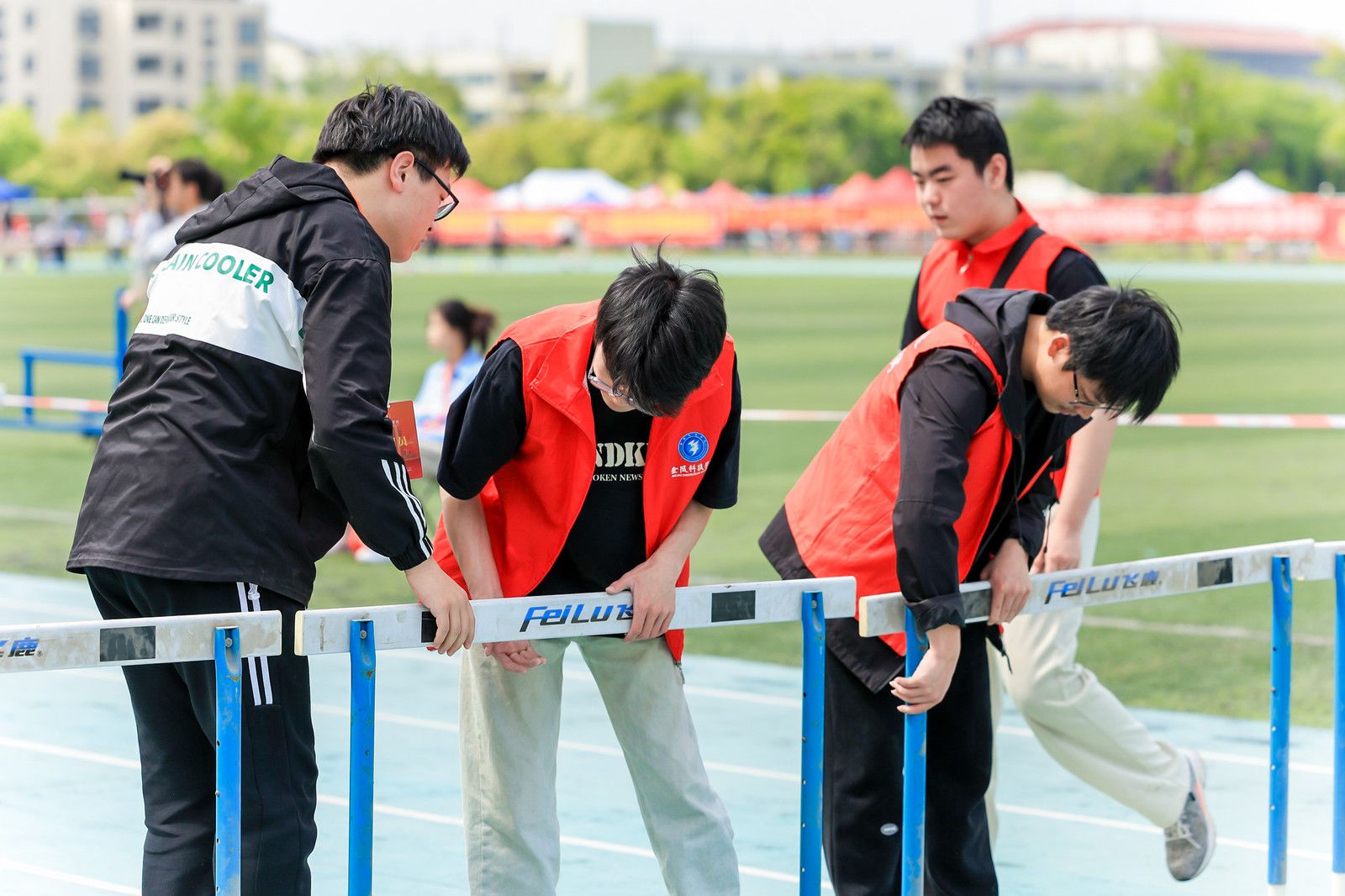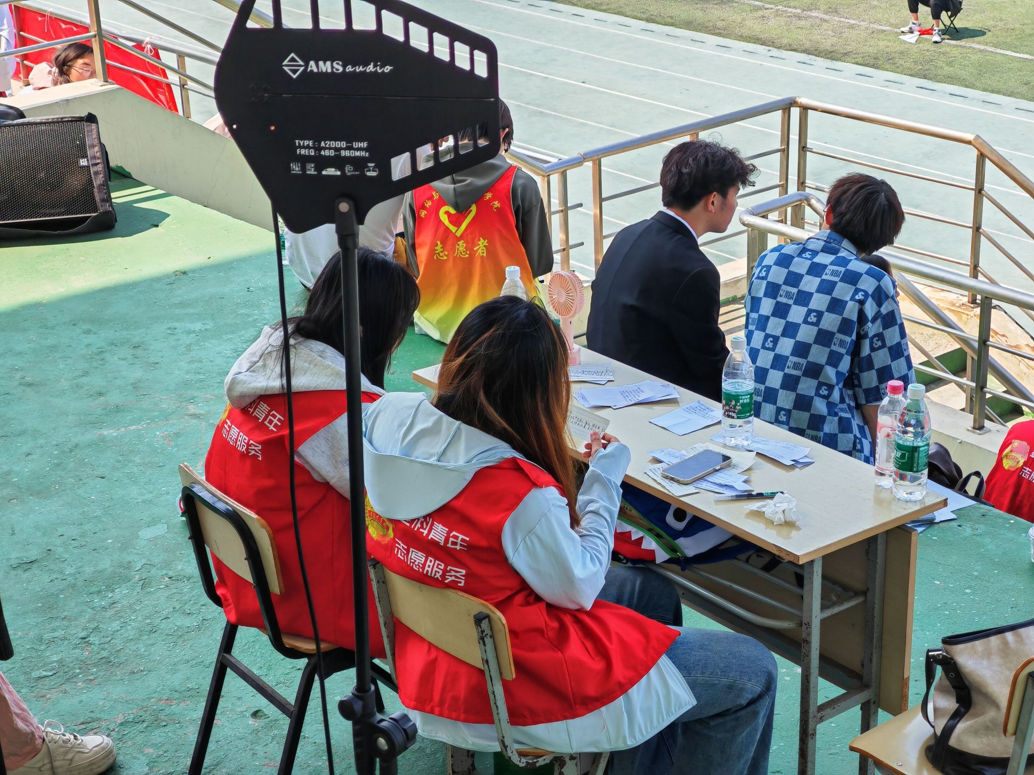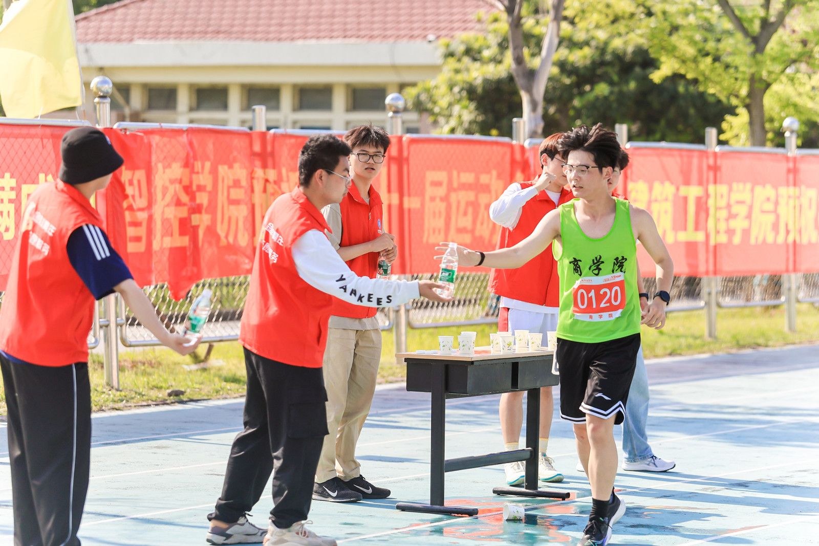 运动会期间,志愿者们身着统一的服装,在赛场的各个角落忙碌着。他们有的负责场地布置,有的协助运动员准备比赛,有的负责比赛场地的秩序维持,有的协助递送加油稿及比赛成绩,有的帮助运动员整理物品、收拾场地。无论在哪个岗位,他们都以饱满的热情和严谨的态度,履行着自己的职责,确保比赛圆满结束。在激烈的比赛中,运动员往往会出现体力不支、口渴难耐的情况,这时有的志愿者手持水杯,为刚跑完一段的运动员递上清凉的水;有的志愿者准备毛巾,为运动员擦拭汗水,好让他们更舒适地继续比赛。志愿者的热情服务让运动员们感受到了温暖和关怀,一句句加油、一杯杯水、一个个关心的眼神让他们坚定了拼尽全力展现自我的勇气和信心。
