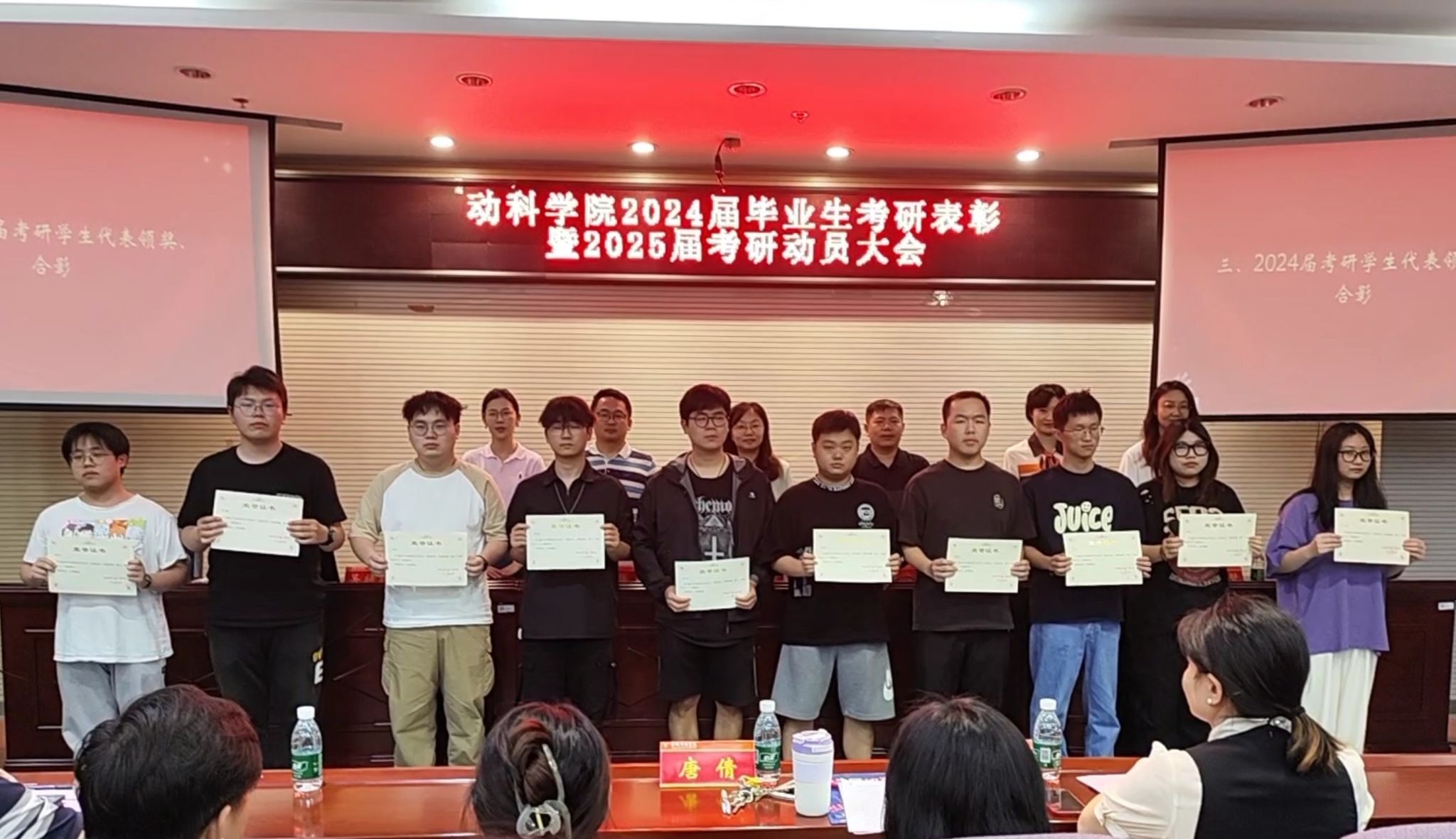 首先,2024届毕业生辅导员魏鹏老师介绍了2024届考研情况,今年我院共有306名毕业生,有73名同学被吉林大学、南京农业大学、苏州大学等高校顺利录取,考研录取率23.85%,其中动物科学专业学生考研率最高,达35%。党委副书记黄淑婧宣读《动物科学与食品工程学院关于表彰2024年度考研先进个人的决定》。随后主席台的领导老师为考研学生代表颁发了荣誉证书并合影留念。
