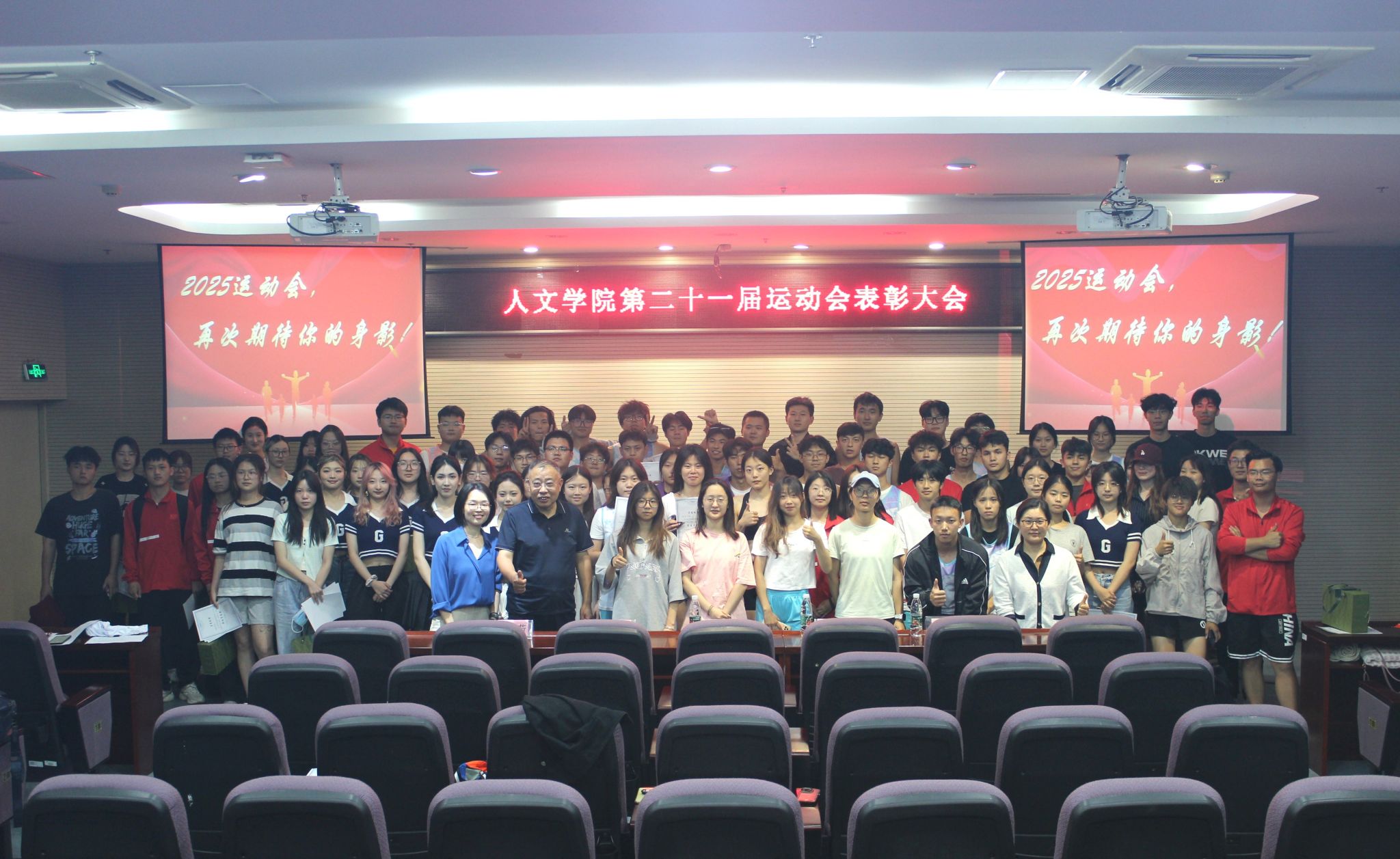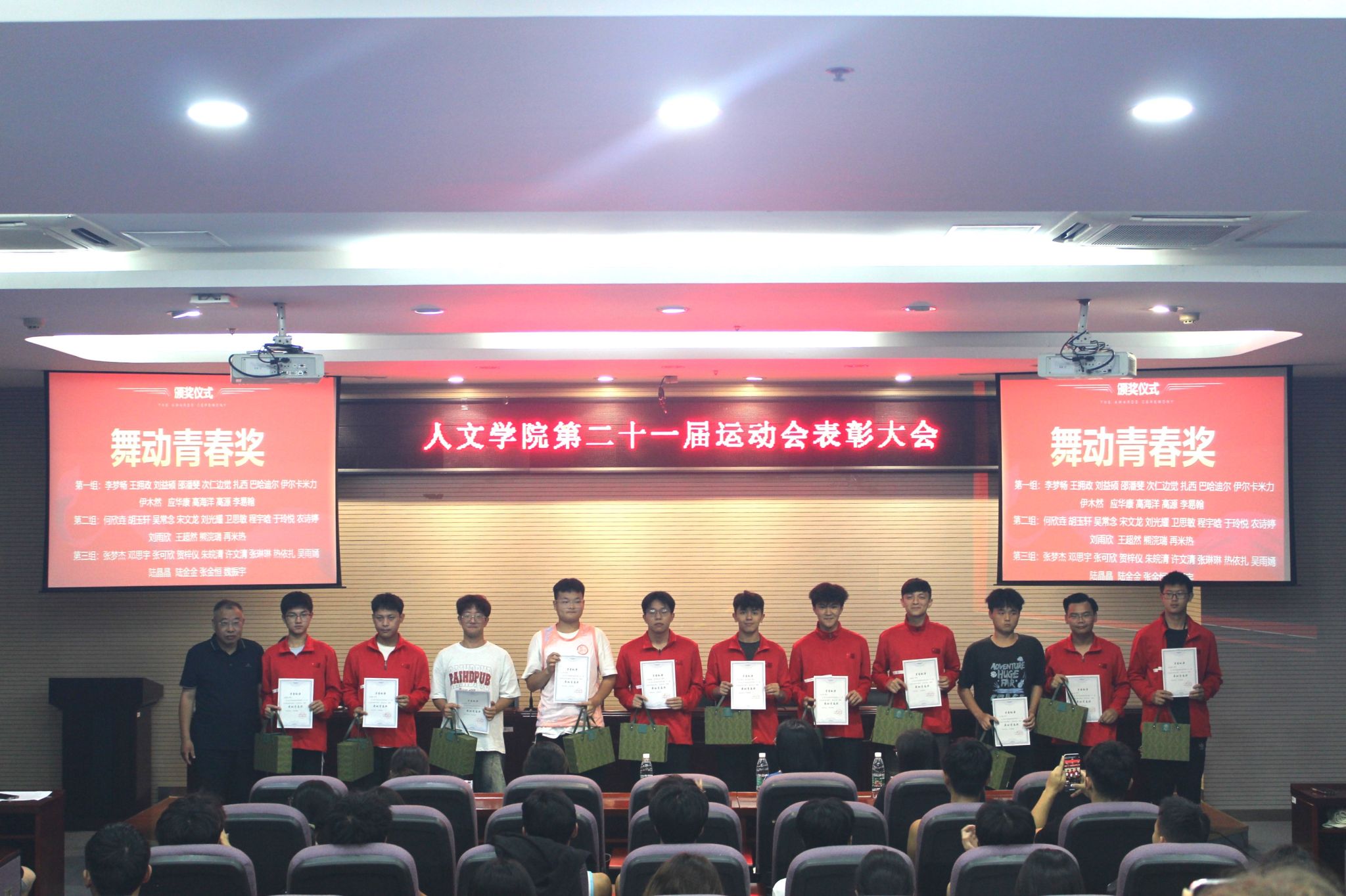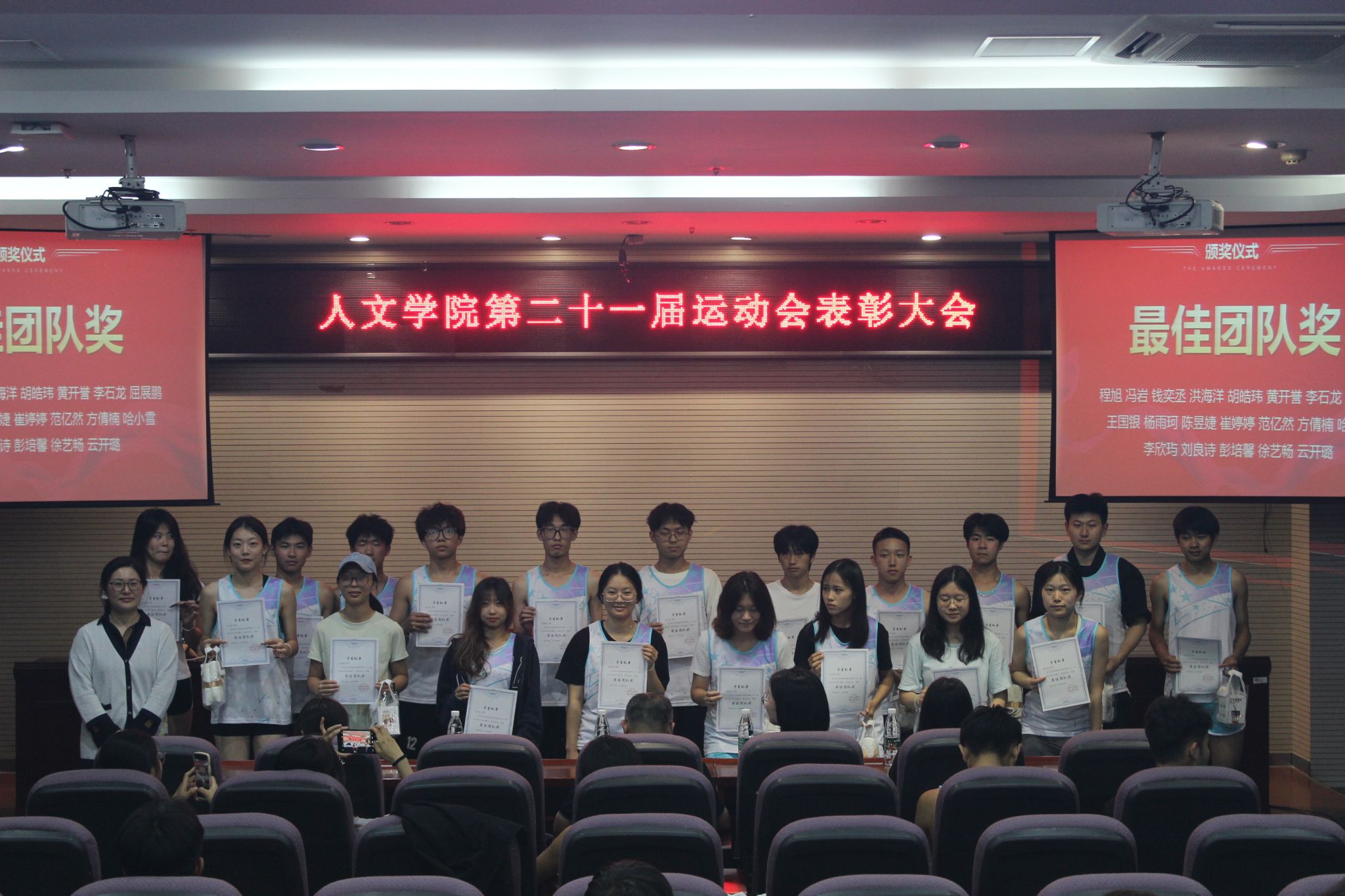 在拼搏中坚持,在奋斗中成长。5月22日晚,人文学院在幕府校区图书馆报告厅隆重举行第二十一届田径运动会表彰大会。人文学院党委书记吴轶军、副书记董宇、辅导员靖晶,与全体优秀运动员、志愿者和各班学生代表参加了活动。