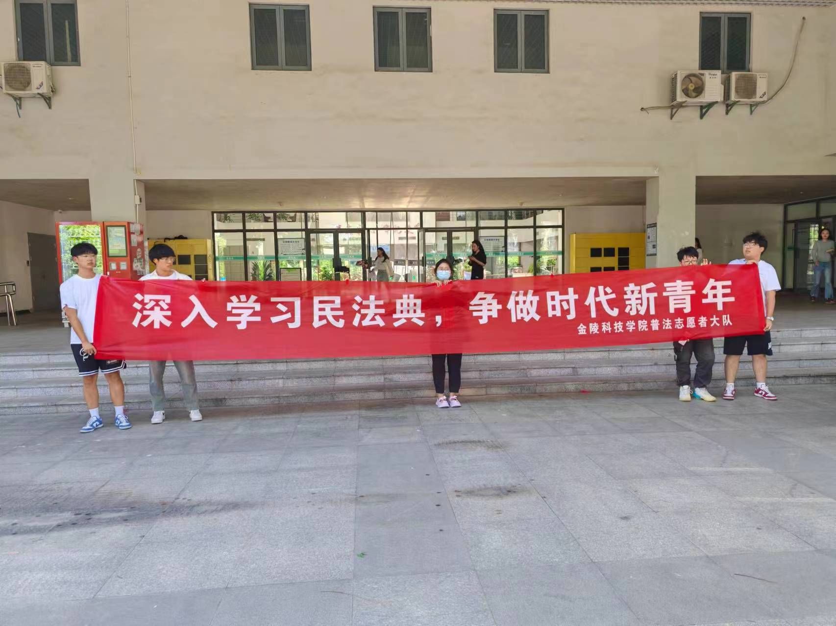 5月15日下午在图书馆前,为使大学生了解、掌握民法典知识,增强法治观念,加强法治校园建设。金科普法大队进行了横幅宣传。通过悬挂横幅,营造了浓厚的法律宣传氛围, “深入学习民法典,争做时代新青年”和“民法‘典’亮时代,新人铸魂工程”等标语,成为了校园里一道亮丽的风景线,吸引了众多师生驻足观看,为同学们创造“法在身边”的校园精神文化氛围,学生在良好的校园环境中受到熏陶,在积极的校园氛围中受到教育。