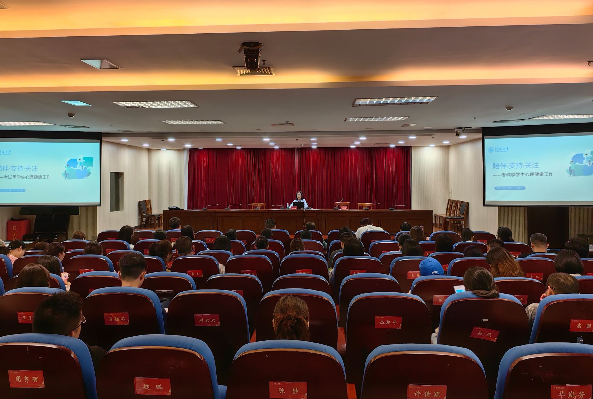 6月28日下午,beat365于图书馆第二报告厅开展辅导员专题培训。此次培训特邀河海大学学生工作处副处长、心理健康教育与研究中心主任刘取芝副教授作主题为《陪伴·支持·关注——考试季学生心理健康工作》讲座,全体辅导员参加了培训。本次培训由学生工作处副处长王姝主持。