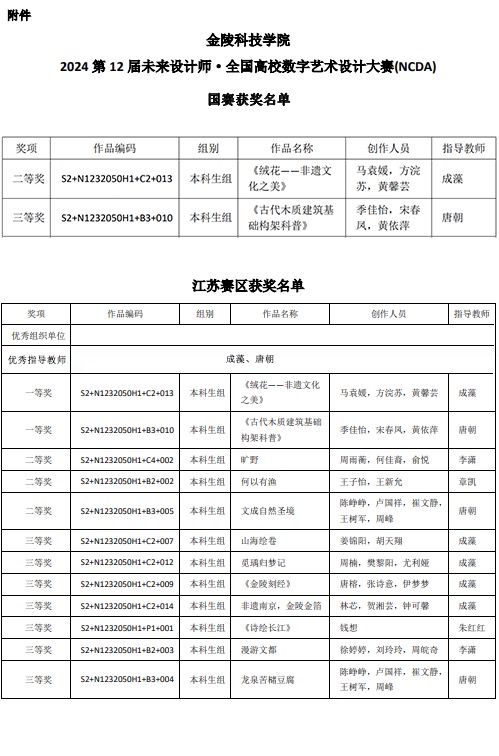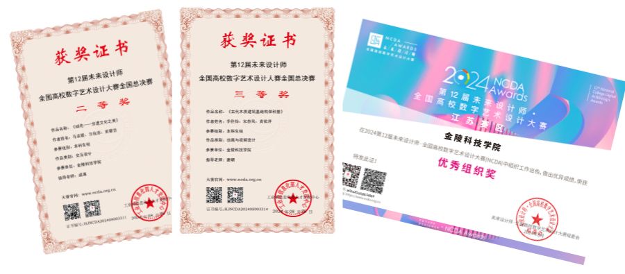 近日,2024年第十二届未来设计师·全国高校数字艺术设计大赛(NCDA)获奖名单公布。动漫学院成藻老师、唐朝老师指导的学生作品《绒花--非遗文化之美》《古代木质建筑基础构架科普》分别获全国总决赛二等奖、三等奖,beat365正版唯一官网必一获“优秀组织奖”。另有多项学生作品在江苏省赛区获奖。自大赛启动以来,动漫学院组建指导老师团队,将课程思政元素、人工智能新技术、科教融合项目融入学科竞赛,不断强化学生数字设计创新能力培养。