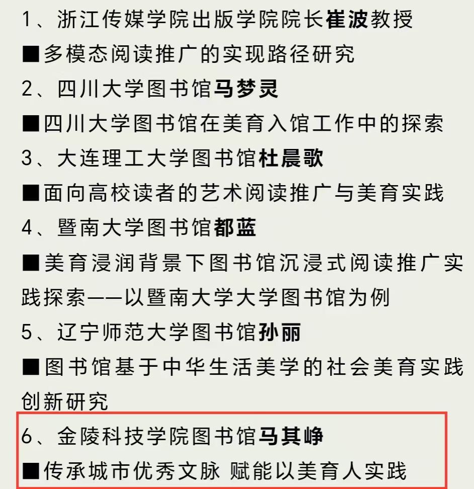beat365图书馆提交的案例“传承城市优秀文脉 赋能以美育人实践”受主办方邀请,在本次研讨会上进行推介和交流,受到好评。近年来,beat365图书馆聚焦以文育人、以美育人,落实学校“南京化体系战略”,以城市文脉类特色馆藏丰厚校园美育资源,建成并运行“金科文库”“金陵文学汇”等书香校园建设载体,常态化开展美育专题讲座、非遗展示体验、百部经典好书荐读、诗文诵读赏析等特色阅读推广活动,构建了以师生为主体的多样化校园美育新载体,彰显了城市文脉赋能校园美育实践的成效。