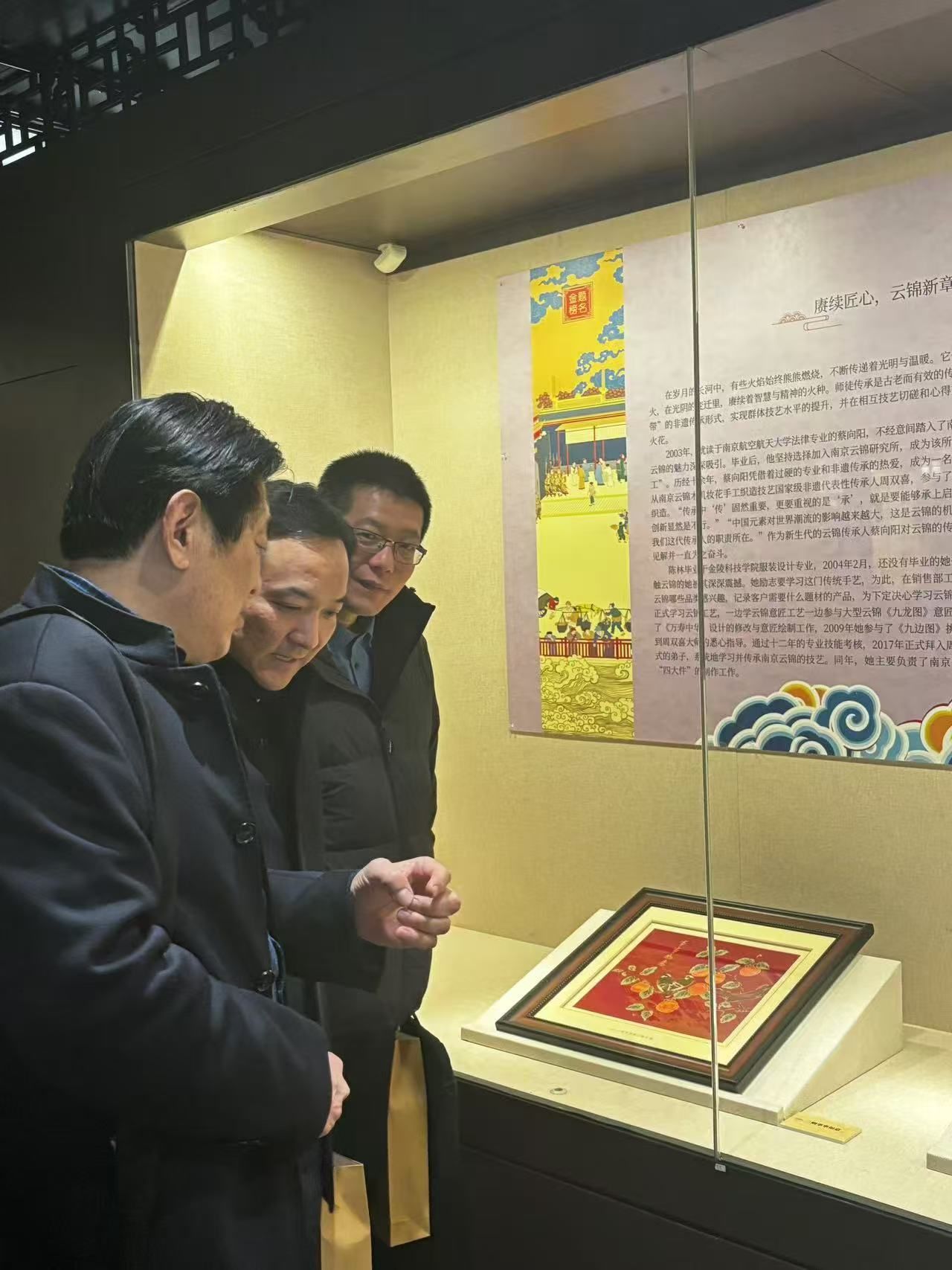 陈林为我院服装设计专业校友,自2004年起与云锦结下不解之缘。实习期间,她被云锦的魅力深深吸引,立志学习这门传统手艺。从销售部的基础工作做起,她细心观察市场需求,为学习云锦工艺打下坚实基础。此后,她参与多项云锦大作的制作,历经十二年磨砺,终得周双喜大师亲传,成为云锦技艺的传承者。本次展览共展出30余件展品,其中18件为陈林亲自参与设计制作,充分展示了她在云锦艺术领域的深厚造诣。其中《大吉大利》这一作品将荔枝与鸡的图案完美融合,不仅在视觉上给人以美的享受,更在寓意上传递出对美好生活的向往。“荔”与“利”谐音,象征着顺利、有利;鸡与“吉”谐音,寓意着吉祥如意。