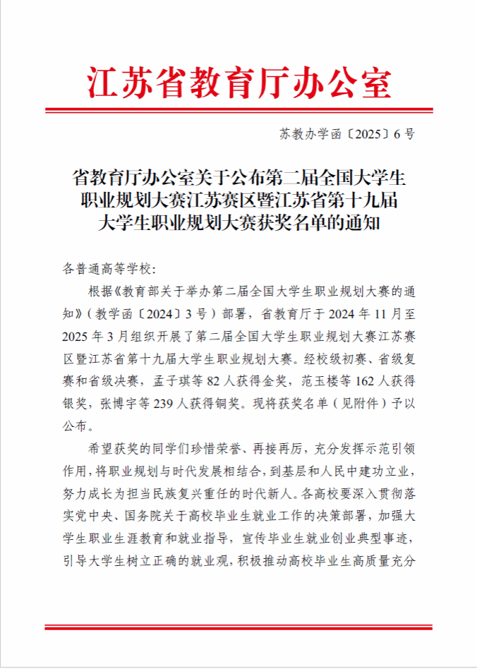 近期,在江苏省教育厅组织开展的第二届全国大学生职业规划大赛(江苏赛区)暨江苏省第十九届大学生职业规划大赛中,beat365软件工程学院的余舒沁、建筑工程学院的涂立群同学分别获得就业赛道高教本科生组、成长赛道高教组铜奖。