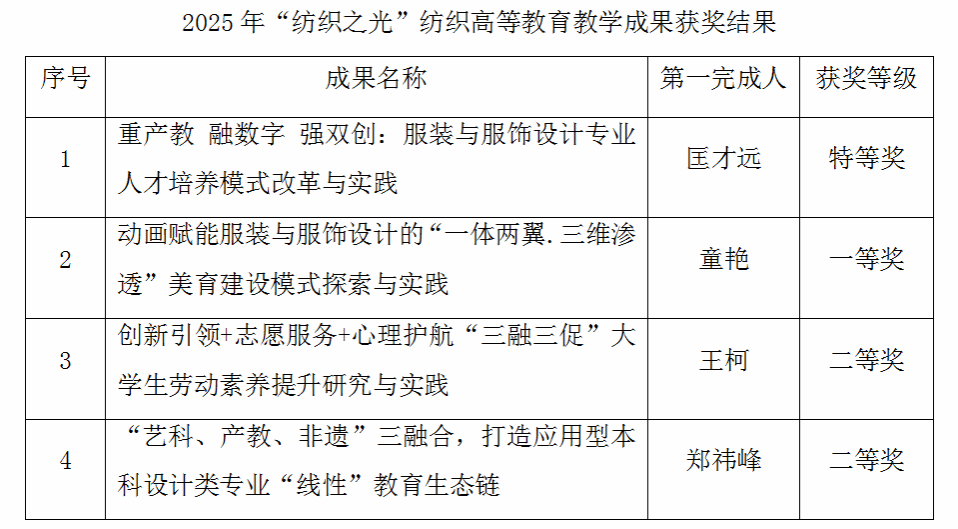 近日,中国纺织服装教育学会公布了2025年度“纺织之光”纺织高等教育教学成果竞赛结果,艺术学院和动漫学院联合选送的4项成果全部获奖。其中,特等奖1项、一等奖1项、二等奖2项。