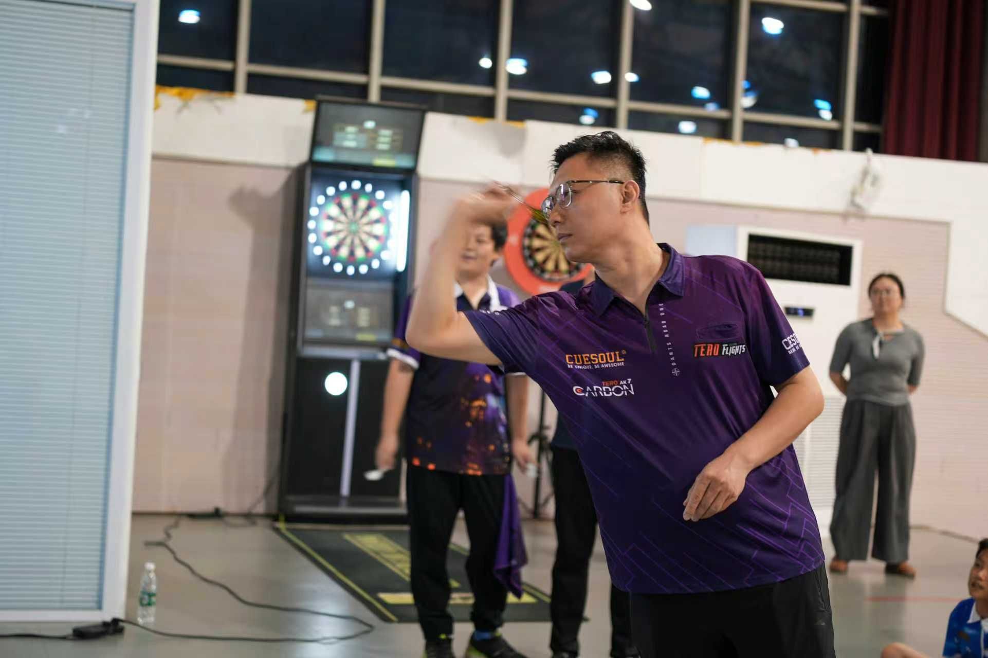 在实践指导环节,刘元军亲自示范标准的投掷姿势,讲解技术要领,耐心指导现场每一位同学。他从如何握镖、站姿,到瞄准、发力、随挥,每一个细节都倾囊相授,让同学们沉浸式地感受到了这项集竞技、智力和心理素质于一体的时尚运动的独特魅力。活动最后,同学们现场观摩了刘元军与刘懿熵两位冠军的软式飞镖精彩对决。