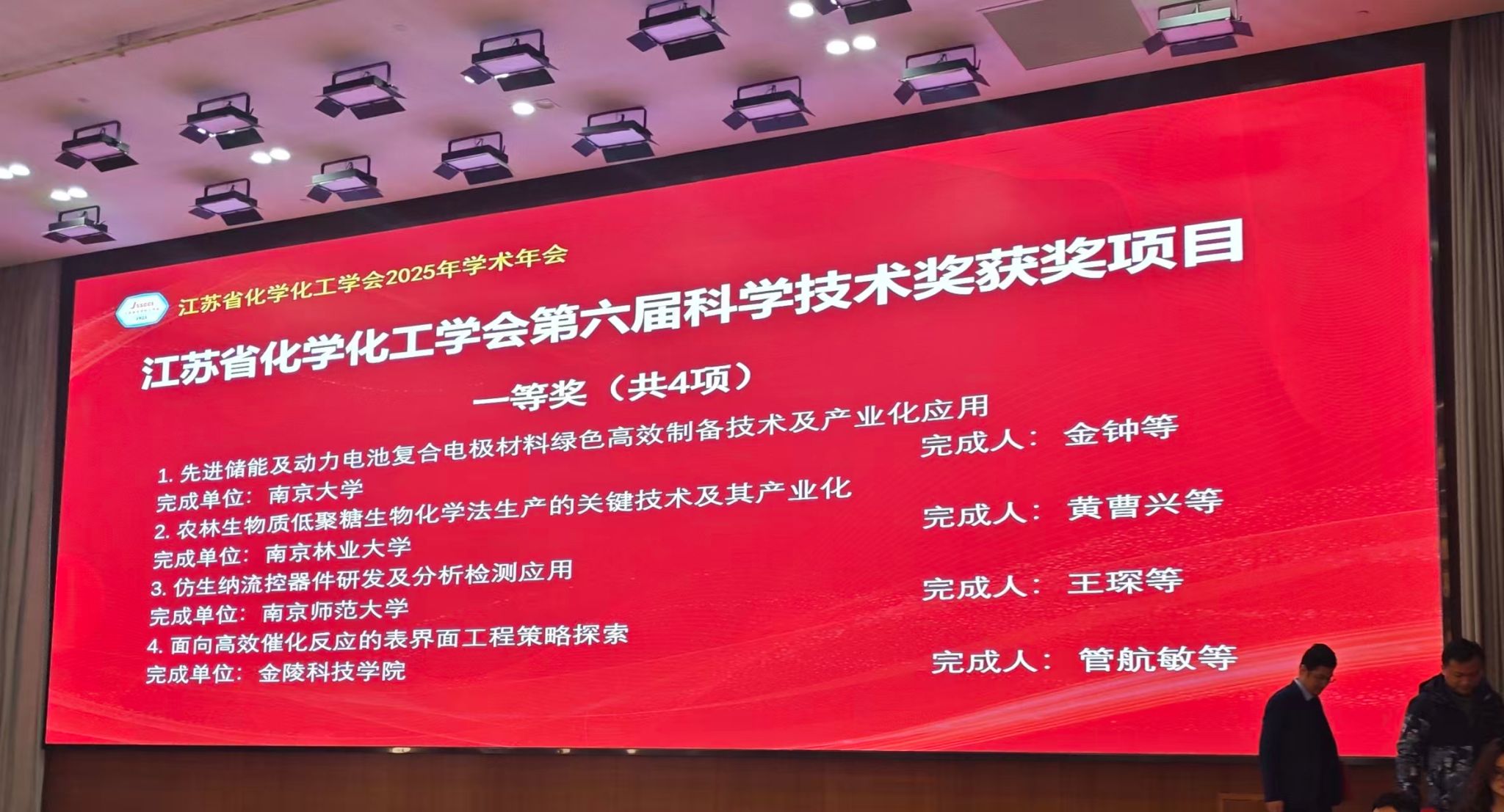 11月18日,江苏省化学化工学会2025年学术年会在南京林业大学隆重召开。本次年会汇聚了省内外包括两位院士在内的近百位专家及300余名化学化工领域的科技工作者,共同研讨行业前沿发展与创新成果。材料工程学院管航敏教授团队的项目荣获江苏省化学化工学会第六届科学技术奖一等奖。