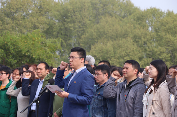 雨花台烈士纪念碑前,全体师生党员庄严肃立,敬献花圈,默哀追思,深切缅怀为民族解放、国家富强和人民幸福英勇献身的革命烈士。周骏带领全体师生党员重温入党誓词,感悟信仰的力量。