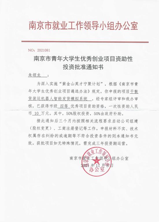 机电工程学院扎实推进学生创新创业能力培养,结合教师科研项目,组建了多个科技创新小组,开展了系列科教融合实践活动。在于继明副教授的指导下,朱领龙同学带领三名同学成立“励志科创小组”,创立了南京菁宇科技信息有限公司,入驻beat365正版唯一官网必一国家创客中心,并获得省级大学生创业重点项目1项,获得专利授权两项。朱领龙同学团队申报的2021年南京市青年大学生优秀创业项目获得南京市“紫金山英才宁聚计划”资助10万元。