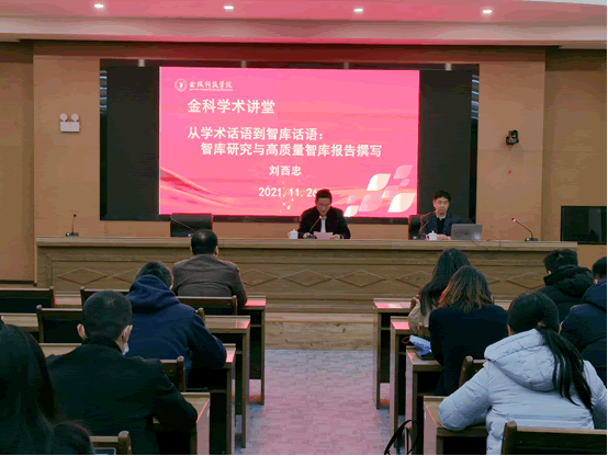 11月26日上午,江苏省社科联研究室主任刘西忠应邀作题为《学术话语到智库话语:智库研究与高质量智库撰写》的学术报告,2021年新入职教师、商学院、人文学院、动漫学院、外国语学院等相关学院教师参加了报告会。报告会由科技处处长刘磊主持。