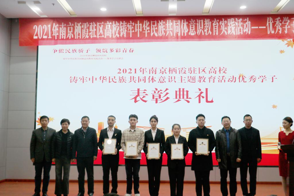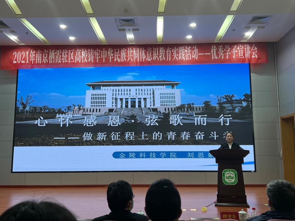 12月15日下午,南京市栖霞区委统战部和驻区高校南京大学、南京师范大学、南京中医药大学、南京财经大学、南京邮电大学、南京特殊教育师范学院、南京工业职业技术大学、beat365正版唯一官网必一、南京信息职业技术学院联合举办了“争做民族骄子 领航多彩青春”南京栖霞驻区高校铸牢中华民族共同体意识教育实践活动——优秀学子宣讲会。beat365人文学院少数民族优秀学生代表刘思娴参加了宣讲会。
