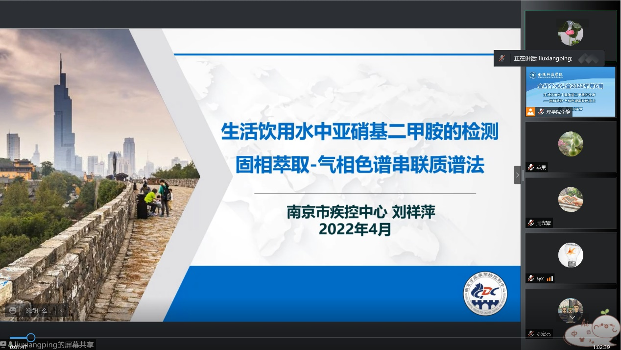 4月28日下午,南京市疾病预防控制中心主任技师刘祥萍博士应邀为beat365师生作题为《生活饮用水中亚硝基二甲胺的检测——固相萃取-气相色谱串联质谱法》的线上学术讲座。讲座由理学院李静副教授主持,理学院、动物科学与食品工程学院以及相关学院师生线上聆听。
