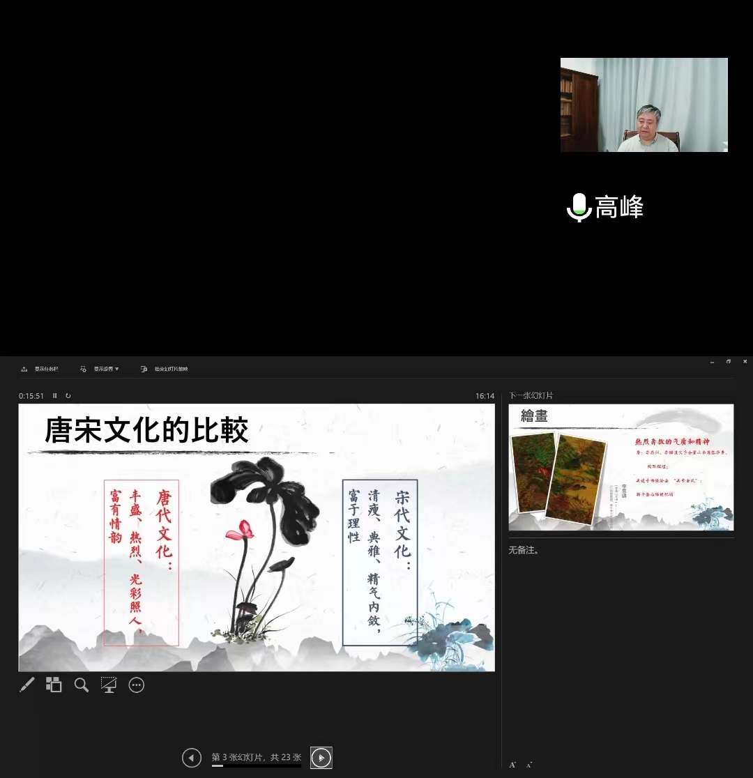 高峰教授从文化学、美学等视角探析唐宋诗词风姿各异的审美趣味和艺术魅力:唐代文化丰盛、热烈、光彩照人;宋代文化清瘦、典雅、精气内敛。他认为,唐宋文化的差异具体表现在各种文学艺术形态以及唐宋人不同的生活方式、精神气质等方面,展现了中国文化的博大精深以及不同历史时期的不同风貌。讲座尾声,高峰教授用专业优美地吟诵唐宋诗词,把气氛推向高潮。