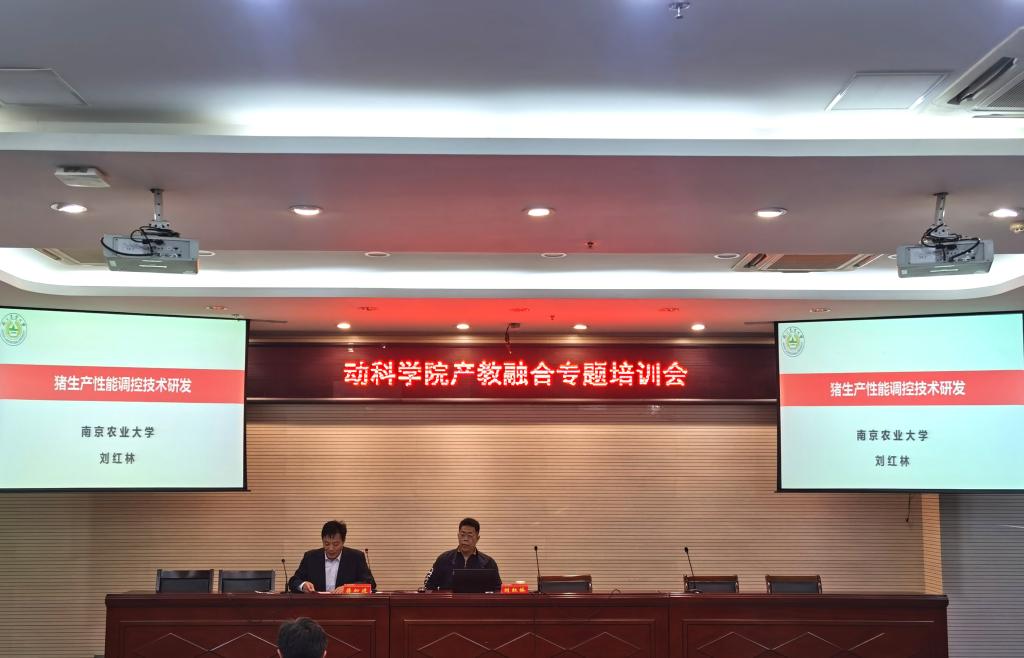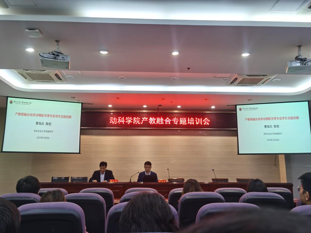 为贯彻落实国务院办公厅《关于深化产教融合的若干意见》 精神,进一步促进教育链、人才链与产业链、创新链的有机衔接,推进产教深度融合,深化高等教育改革。10月9日,动物科学与食品工程学院组织学院全体教师参加产教融合专题培训会,邀请南京农业大学动物医学院副院长曹瑞兵教授、南京农业大学动物科技学院刘红林教授作培训报告。会议由副院长蒋加进主持。