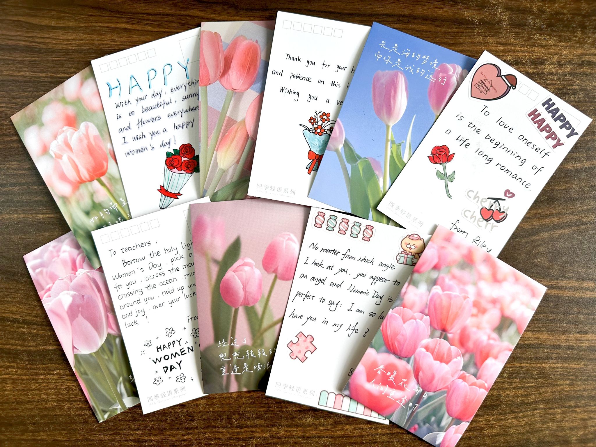 学生的成长离不开老师的谆谆教诲。在这美好的节日,院分工会联合学工办组织学生给女教师们送上手写明信片和美丽的玫瑰花。21英语(1)班学生周灿灿在明信片上写道:“桃李不言,下自成蹊;天涯海角有尽处,师恩绵绵无绝期。感谢老师的栽培与照顾,爱你们。”21英语(2)班学生沈羽菲说:“进入外院的第二年,我深深地感受到每位老师对学生的尽心尽力。她们的循循善诱、谆谆教诲都给我很大的影响与启迪。希望可以通过卡片传达我对老师们的尊敬与感谢之情。”22英语(2)班学生刘姝妍用英语书写对老师的感激和祝福之情:“A teacher affects eternity, she can never tell where her influence stops. Thanks for being such a great teacher. Happy Women's Day!”