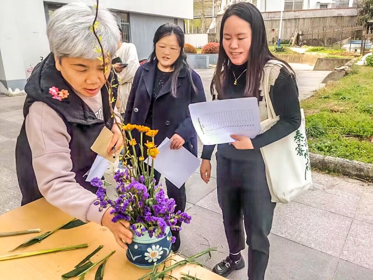 活动当天,同学们运用瓶、盆、篮、缸等不同的器皿,根据不同的花材、不同的色彩进行艺术创作。新鲜的花材在同学们手中变幻出不一样的美感。有的作品架构采用了中国古建斗拱元素,用传统与现代相结合的橙色系园艺品种,展现幸福生活,歌颂伟大祖国;有的作品采用颜色典雅的洋桔梗和康乃馨,营造诗意一般的云舒淡雅,让人仿佛看到了浓缩的一幅春景图。