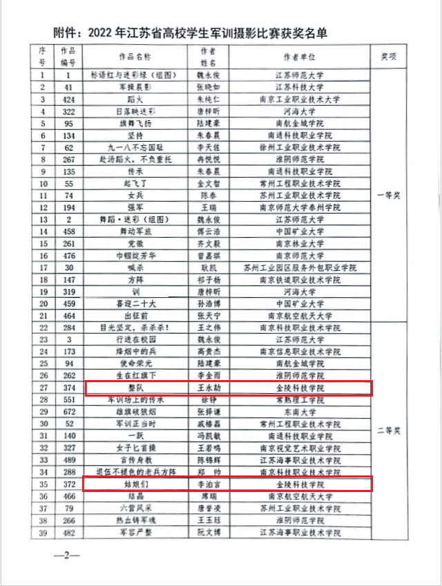日前,江苏省高教学会国防教育研究会公布了2022年江苏省高校学生军训摄影比赛评选结果,beat365学生投稿作品分别获得二等奖两项、三等奖一项。