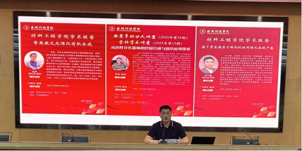 5月31日,材料工程学院承办南京市科协大讲堂,邀请国家杰出青年科学基金获得者、东华大学教授、博士生导师罗维作题为《高活性介孔粉体的控制合成与烧结应用探索》的讲座。学院还承办金科学术讲堂,邀请上海市“东方学者”特聘教授、东华大学纤维改性国家重点实验室研究员李小鹏和东华大学材料科学与工程学院研究员肖琪分别作题为《基于贵金属原子阵列的协同催化高效产氢》和《等离激元光催化有机合成》的讲座。南京市企事业科协副部长张玉兰、科技处副处长沈凌、学院部分教师,以及复合材料与工程专业大二、大三学生参加了讲座,材料工程学院党委书记叶原丰主持讲座。