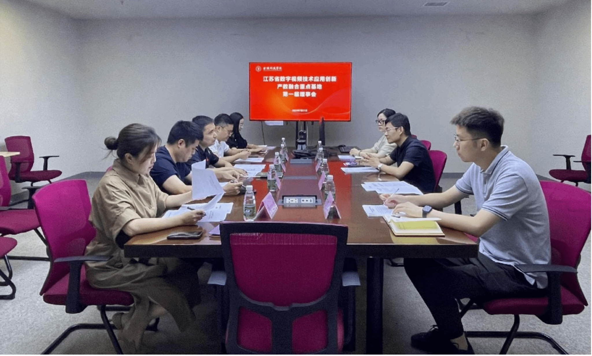 7月31日下午,江苏省数字视频技术应用创新产教融合基地第一届理事会在江苏原力数字科技有限公司会议室召开,动漫学院院长王贤波、南京炫佳网络科技有限公司总经理秦林与副总经理陈宁一、江苏原力数字科技股份有限公司副总裁董自亭以及第一届理事会成员、产教融合基地校内工作人员参加会议。