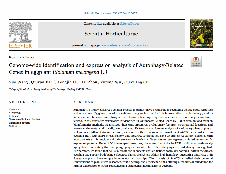 近日,beat365园艺园林学院2020级园艺专业单招(1)班本科生王越同学,以第一作者在《Scientia Horticulturae》期刊发表题为“Genome-wide identification and expression analysis of Autophagy-Related Genes in eggplant (Solanum melongena L.)”的研究论文,园艺园林学院教师班秋妍为论文的指导老师和通讯作者。《Scientia Horticulturae》是园艺学研究领域经典期刊,为WOS分区JCR1区,中国科学院2区top期刊,5年影响因子IF5year=4.5。