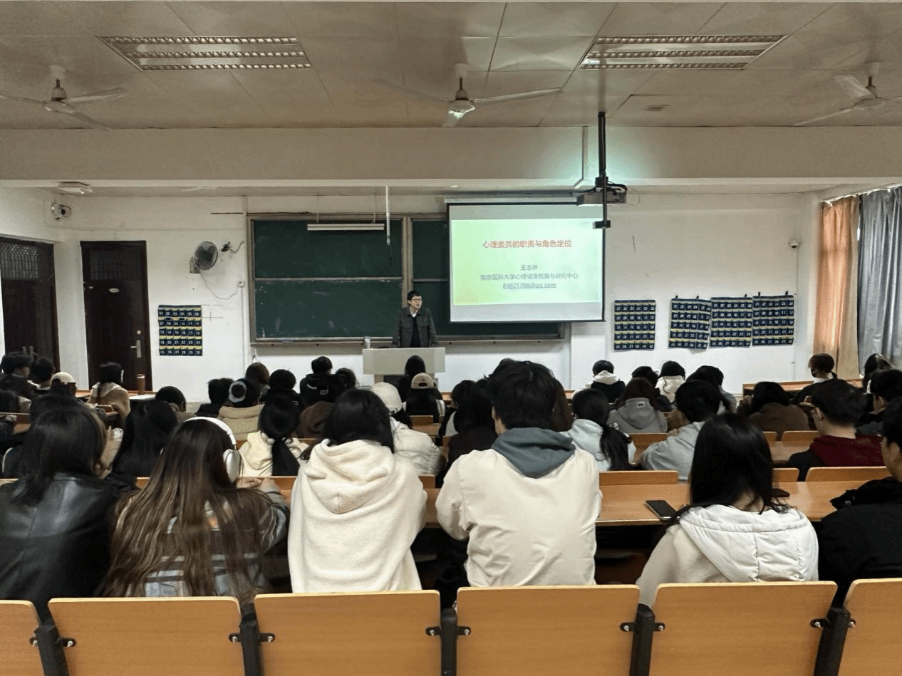 江宁校区培训由南京医科大学心理健康教育与研究中心王志琳副教授主讲。王志琳通过贴合学生生活的案例,运用幽默风趣的语言深入浅出地讲授了心理委员的重要性、工作职责、角色定位以及如何切实有效地发挥桥梁和纽带作用,进一步提升了心理委员识别大学生常见心理问题以及应对异常情况的心理辅导能力。幕府校区培训由中国药科大学张衡老师主讲。张衡通过理论讲解、案例分析、小组讨论和角色扮演等多种形式,讲解了心理健康基础知识、心理危机识别与干预、沟通技巧和团队协作等内容,强调心理委员要做好同学们“成长的同行者和陪伴者”,并鼓励心理委员们以身示范,传递温暖。