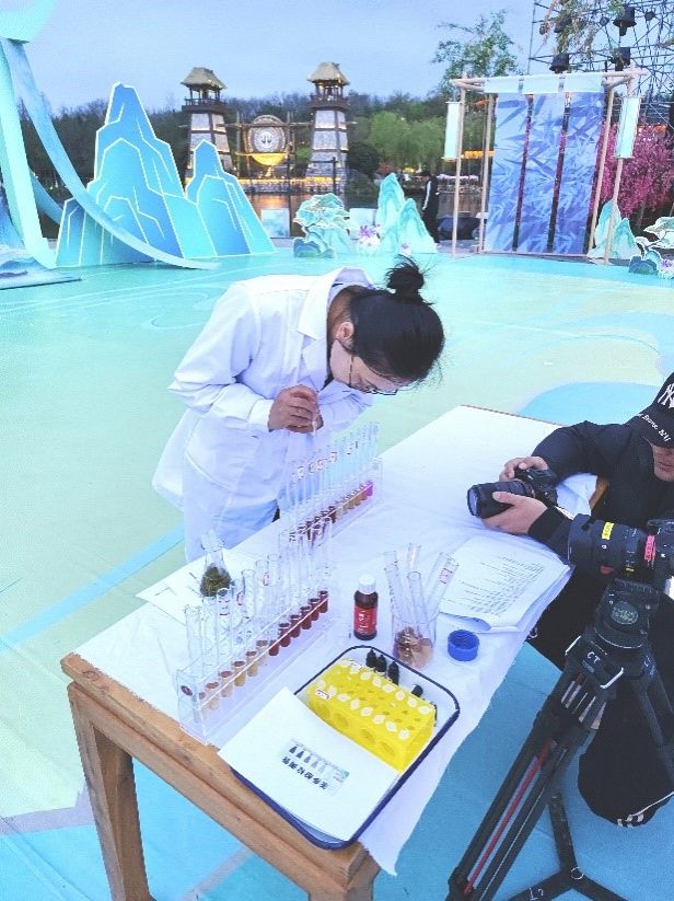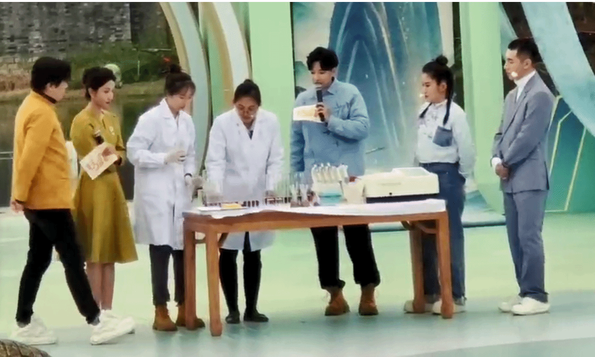 在录制现场,董瑞霞向观众介绍了茶多酚的分类,讲解了茶多酚检测试剂管及准确检测茶多酚含量的相关要求,解释了茶多酚与茶叶口感的关系,并通过两项小实验向观众直观地展示了茶多酚的抗氧化能力。实验中,董瑞霞带领五位节目主持人分别向含有氧化剂的试管中加入不同剂量的茶汤,随着茶汤的加入,试剂颜色皆呈现了由深变浅的梯度变化,这种明显且快速的变化使得现场的观众发出了一片惊叹声。