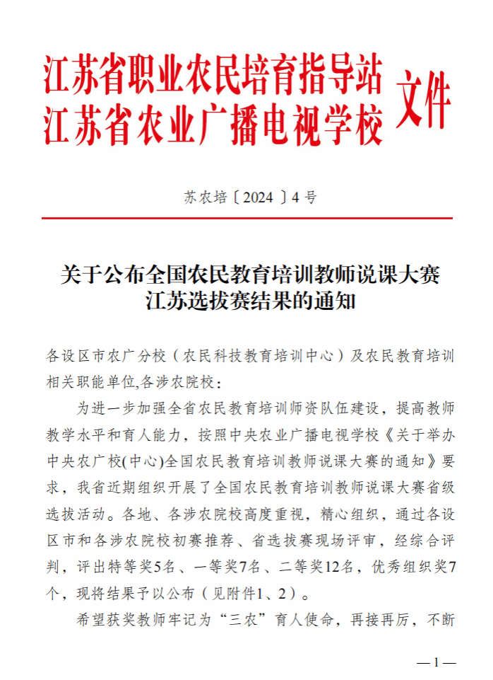 本次比赛由江苏省农业广播电视学校主办,江苏农林职业技术学院承办。主办方按照中央农业广播电视学校《关于举办中央农广校(中心)全国农民教育培训教师说课大赛的通知》要求开展全国农民教育培训教师说课大赛省级选拔活动,评审专家按照中央农广校制定的说课大赛评分标准结合现场说课效果进行综合评定。参赛单位包括省内各设区市农广分校(农民科技教育培训中心)、农民教育培训相关职能单位及各涉农院校。通过各设区市和各涉农院校初赛推荐、省选拔赛现场评审,经综合评判,比赛评出特等奖5名、一等奖7名、二等奖12名,优秀组织奖7个。