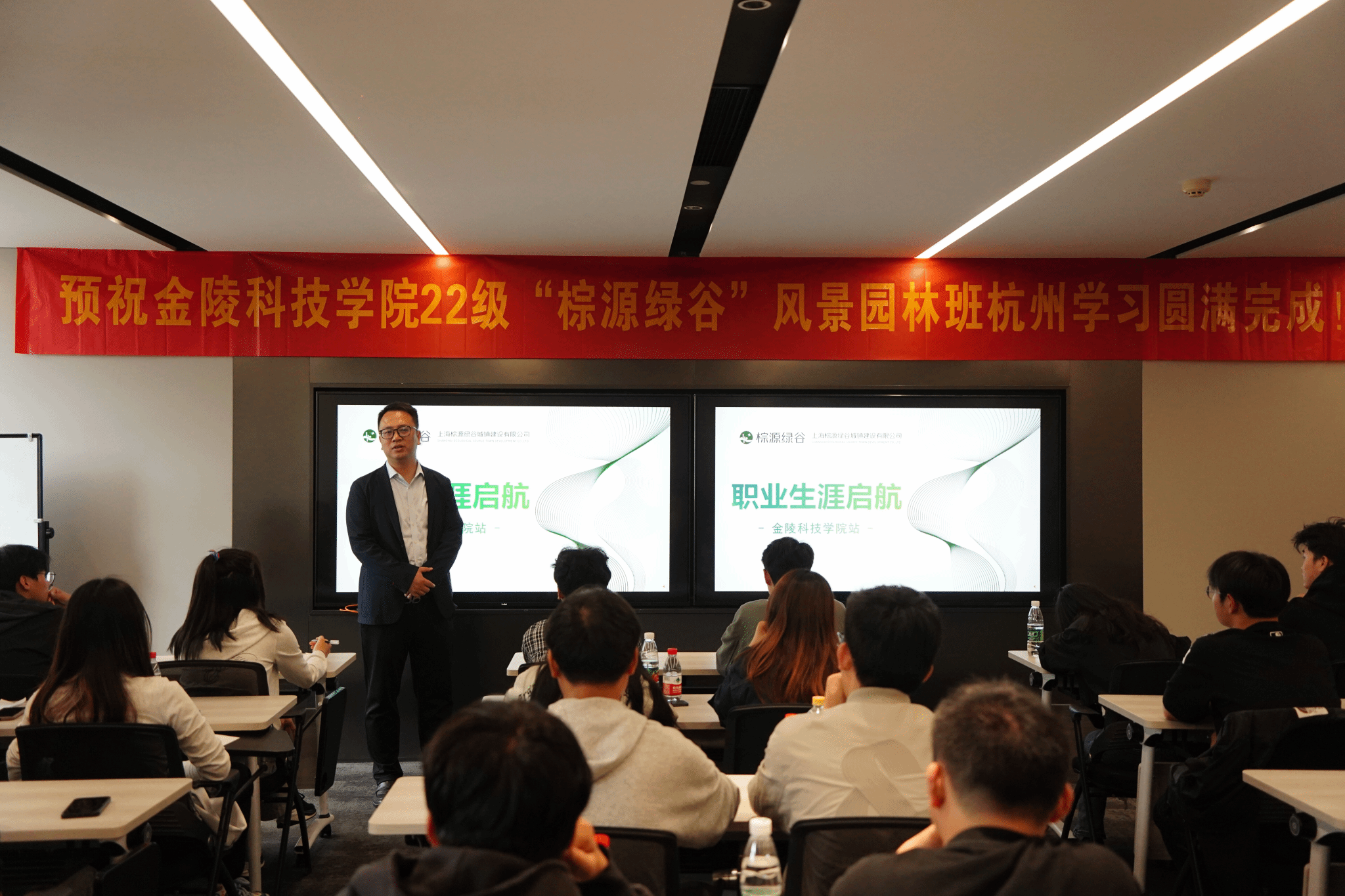 4月21日下午,上海棕源绿谷城镇建设有限公司浙江第一总监部高级总监崔旭飞(2007级校友)、高级项目经理张锴(2014级校友)、高级成本经理吴慧敏、人才发展经理崔振华、项目经理陈磊为冠名班级开展就业指导系列活动。活动的第一环节是行政、工程、设计和预结算就业指导。崔振华主讲的人力行政就业指导课程从走进棕源、校招岗位职业发展、薪酬福利三个方面展开,详细介绍了棕源绿谷的发展历程、四大产品线、企业文化、岗位需求、薪资福利等内容。张锴主讲的园林工程就业指导从园林工程行业概述、园林就业方向、园林工程就业指导、棕源晋升架构四个方面展开,详细介绍了园林工程方向的就业准备及人才需求。陈磊主讲的园林设计就业指导从景观设计行业概述、就业领域、就业岗位、就业要求、职业路径、就业准备等六个方面展开。