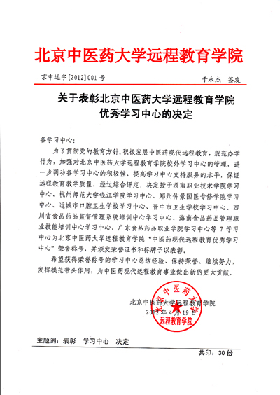 | 近日,北京中医药大学远程教育学院发文《关于表彰北京中医药大学远程教育学院优秀学习中心的决定》(京中远字〔2012〕001号),对在2011年度中医药现代远程教育工作中取得优异成绩的学习中心进行表彰,pp电子游戏官网获得2011年度优秀学习中心荣誉称号。 2011年,pp电子游戏官网全体工作人员通过不懈努力,在招生、管理、考试等环节都取得了显著成绩,招生数量稳步提高,管理服务日趋到位,课程考试严格规范,保证了教学质量。在北京中医药大学远程教育学院组织的测评中,学员对我学习中心各项工作表示满意,满意率在全国27个学习中心中名列前茅,受到北京中医药大学远程教育学院的表彰,为学院赢得了荣誉。