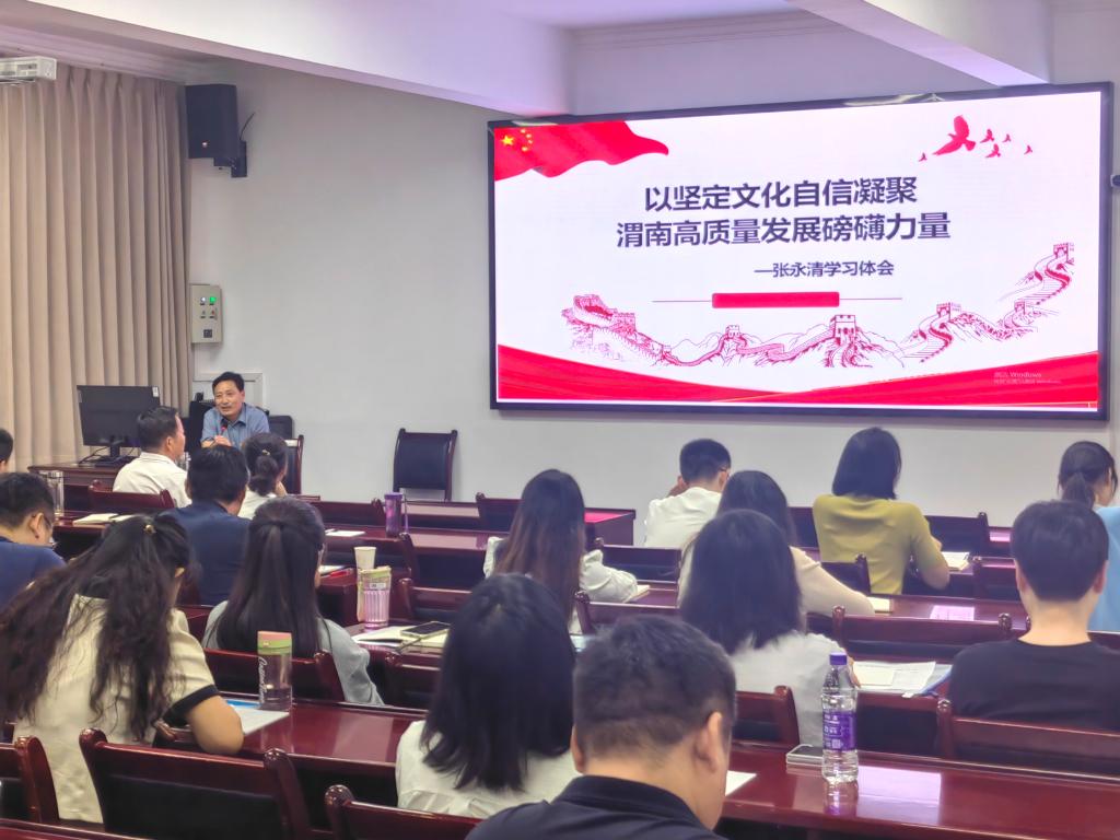 张永清以《坚定文化自信凝聚渭南高质量发展磅礴力量为题》为题,讲述仓颉造字,汉字演进,杜康酿酒,红色文化等地域历史和传统,结合个人成长,揭示要敬畏自然、热爱本土、自我拔节的深厚寓意。李智民以《国学经典中的人生哲学》为题,从万事万物运动变化的规律,理解国学中的哲学智慧,明透处世哲理,积蓄内修力量,增强前行动力。王天明的毛泽东诗词赏析,以独特视觉铺展毛泽东诗词,展示伟人非凡气度、宽广胸襟、大气磅礴,远见卓识的非凡才能和独特魅力。王轶英以《钟灵毓秀,下邽三贤》为题,栩栩如生、精致刻画渭南下邽三贤张仁愿、白居易、寇准的动人故事、历史地位和杰出贡献。惠夏云以《国学智慧的现实意义》和《一蓑烟雨任平生--走进苏轼》为题,讲述中华传统文化源远流长,博大精深,连绵不绝,光芒四射,有用之不尽、取之不竭的力量。系统阐释苏轼波澜壮阔的坎坷人生,逆境中安之若素,苦难中乐观豁达,值得后世永远敬仰。