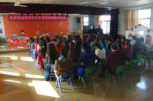 实践课教学是“国培”工作的重要一环。《教育部关于深化中小学教师培训模式改革,全面提升培训质量的指导意见》明确要求:“实践性课程应不少于教师培训课程的50%”。根据今年pp电子幼师国培第一期课程安排,为了解我市学前教育先进的保教管理经验,10月24日上午,幼师国培全体学员分两组分别前往渭南市临渭区示范幼儿园、小哈佛中英文幼稚园现场观摩幼儿园教学活动。