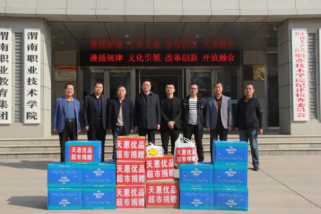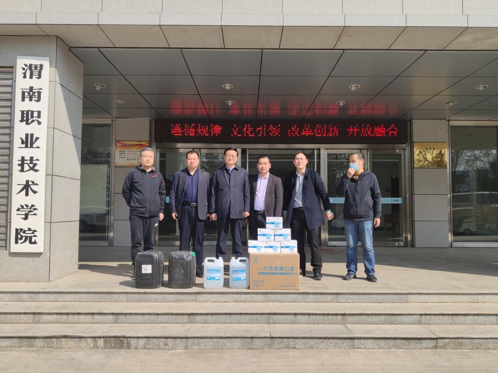 “同舟共济度时艰,众志成城战疫情。”3月23日上午,两家爱心企业带着浓浓的爱心来到学校,为pp电子捐赠大批防疫物资,助力学校疫情防控工作。渭南天惠优品超市经理袁新一行四人,给学校捐赠了500个医用一次性口罩,医用红外额温计2支,120瓶84消毒液,30瓶医用酒精,240瓶矿泉水。西安食通餐饮管理有限公司总经理杨小红一行2人,为学校捐赠了600个一次性口罩,100升84消毒液,2桶医用酒精。