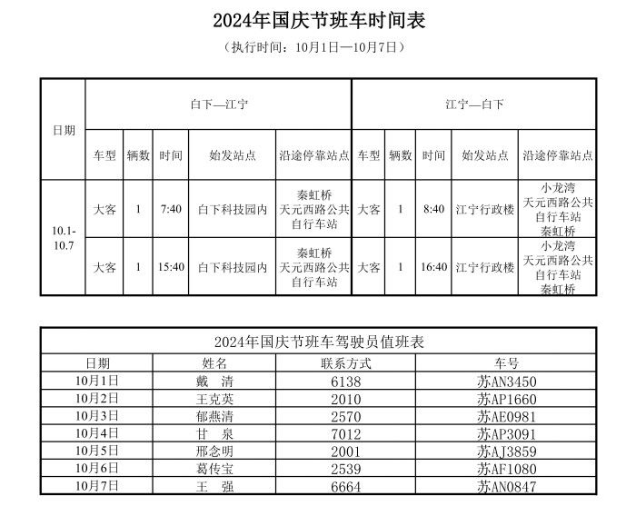 根据2024年国庆节放假安排,9月29日(星期日)、10月12日(星期六)执行本学期正常工作日班车,2024年国庆节班车时间安排(10月1日—10月7日)如下: