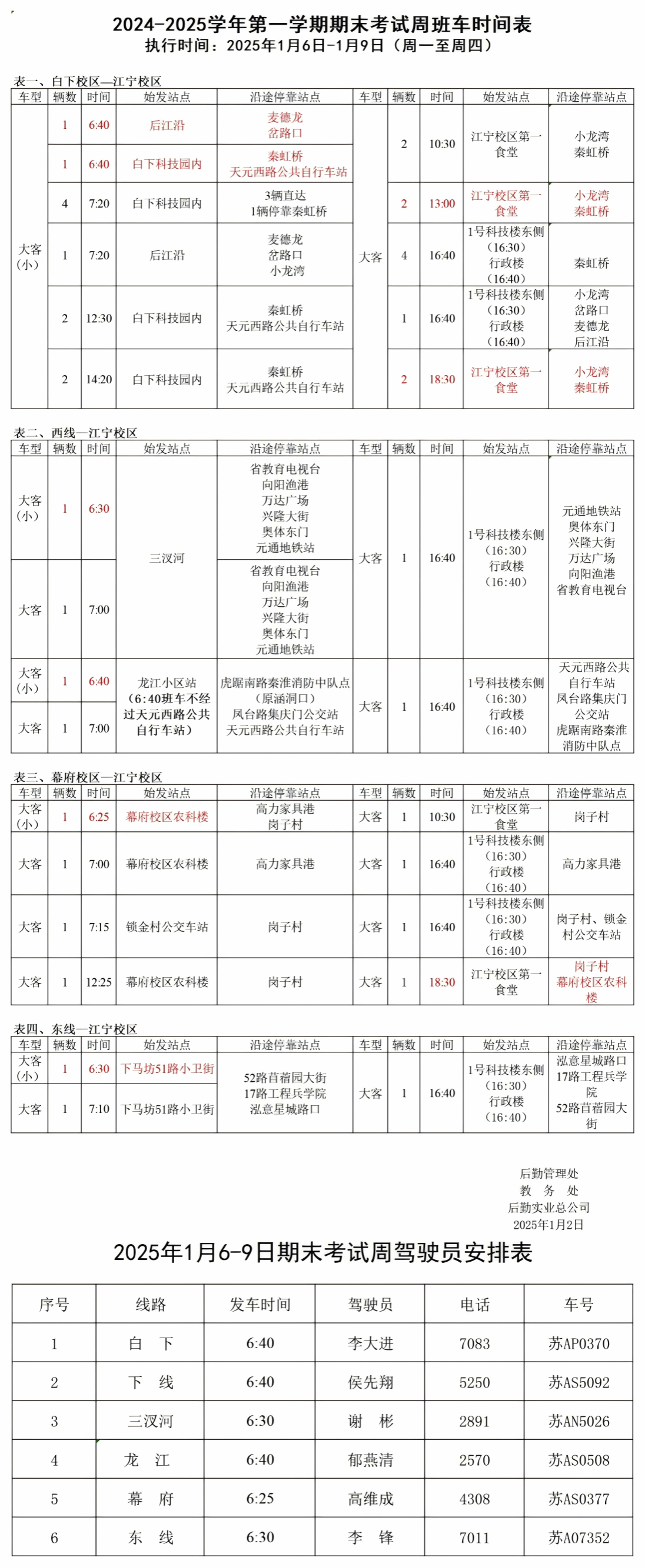 根据学校工作安排,现将2024-2025学年第一学期期末考试周班车时间安排(1月6日-1月9日)公布如下: