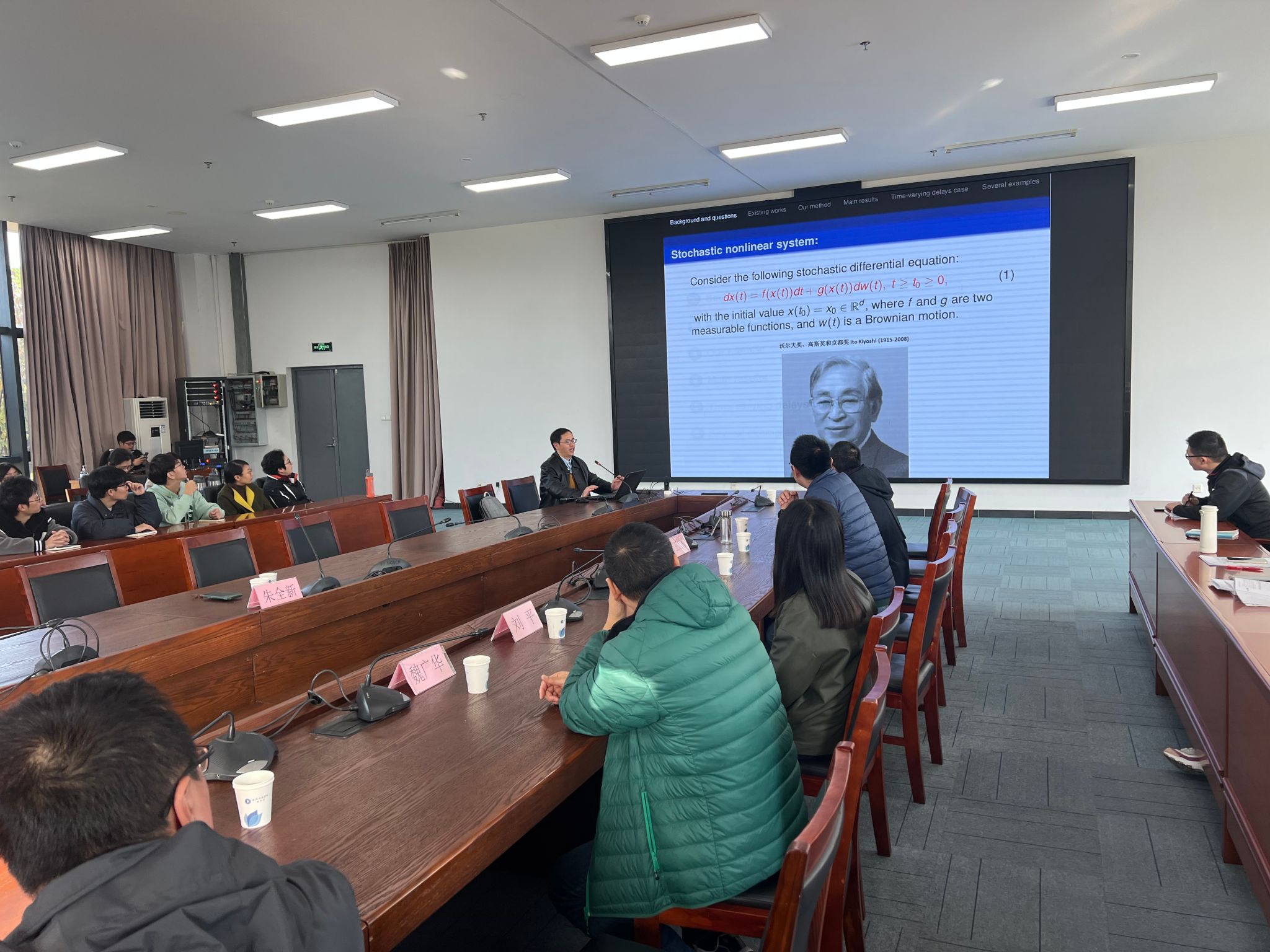 朱全新通过引入输入到状态实用稳定性概念和事件触发策略,建立系统输入到状态的实用指数均方稳定性准则;通过设计反馈增益矩阵和事件触发反馈控制器介绍如何研究稳定性问题;介绍了具有外部扰动的随机非线性时滞系统的事件触发反馈控制问题。他的讲解,深入浅出,引起了在场师生浓厚的兴趣并纷纷提问。对老师们的提问,朱全新用直观的语言给予了一一解答。